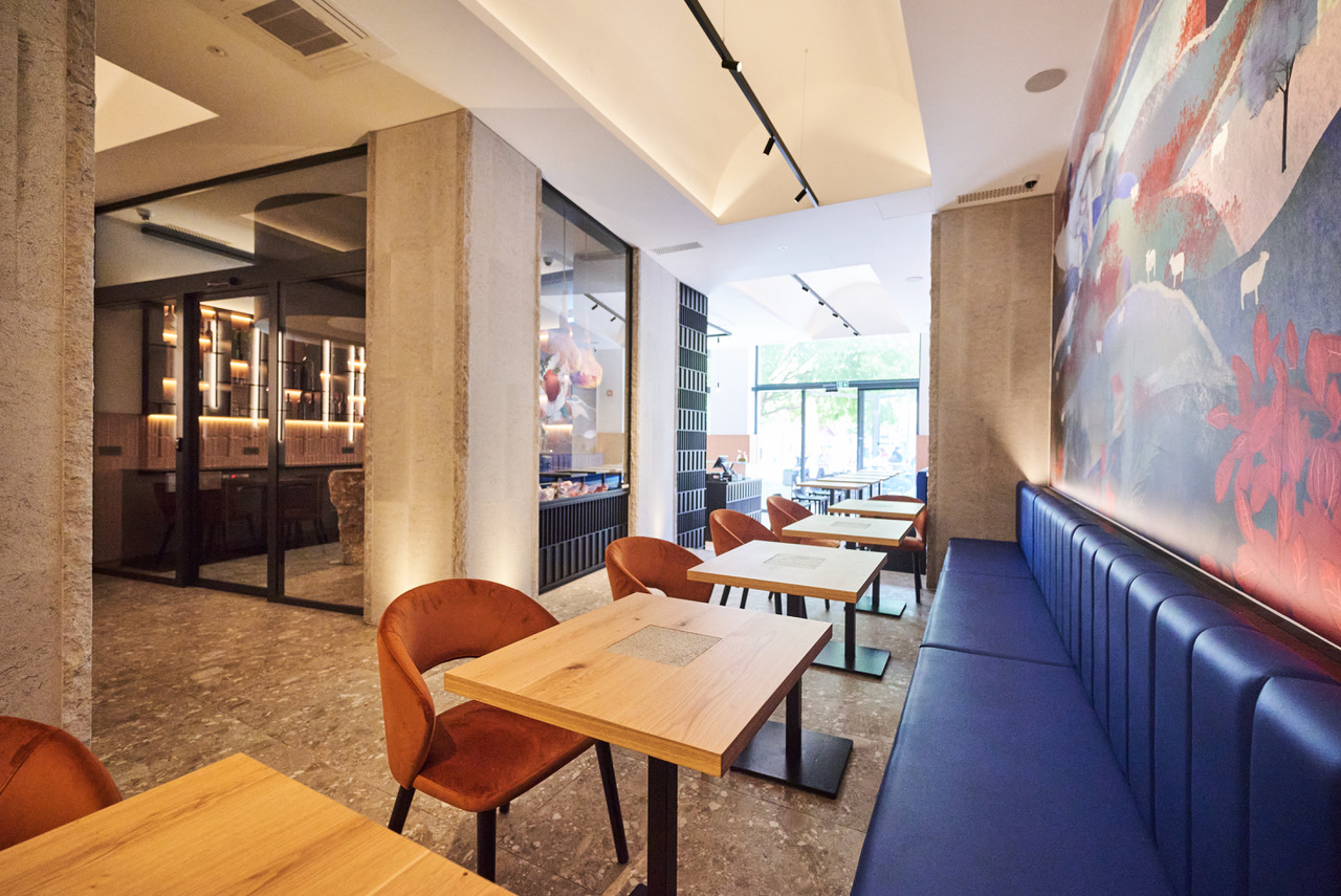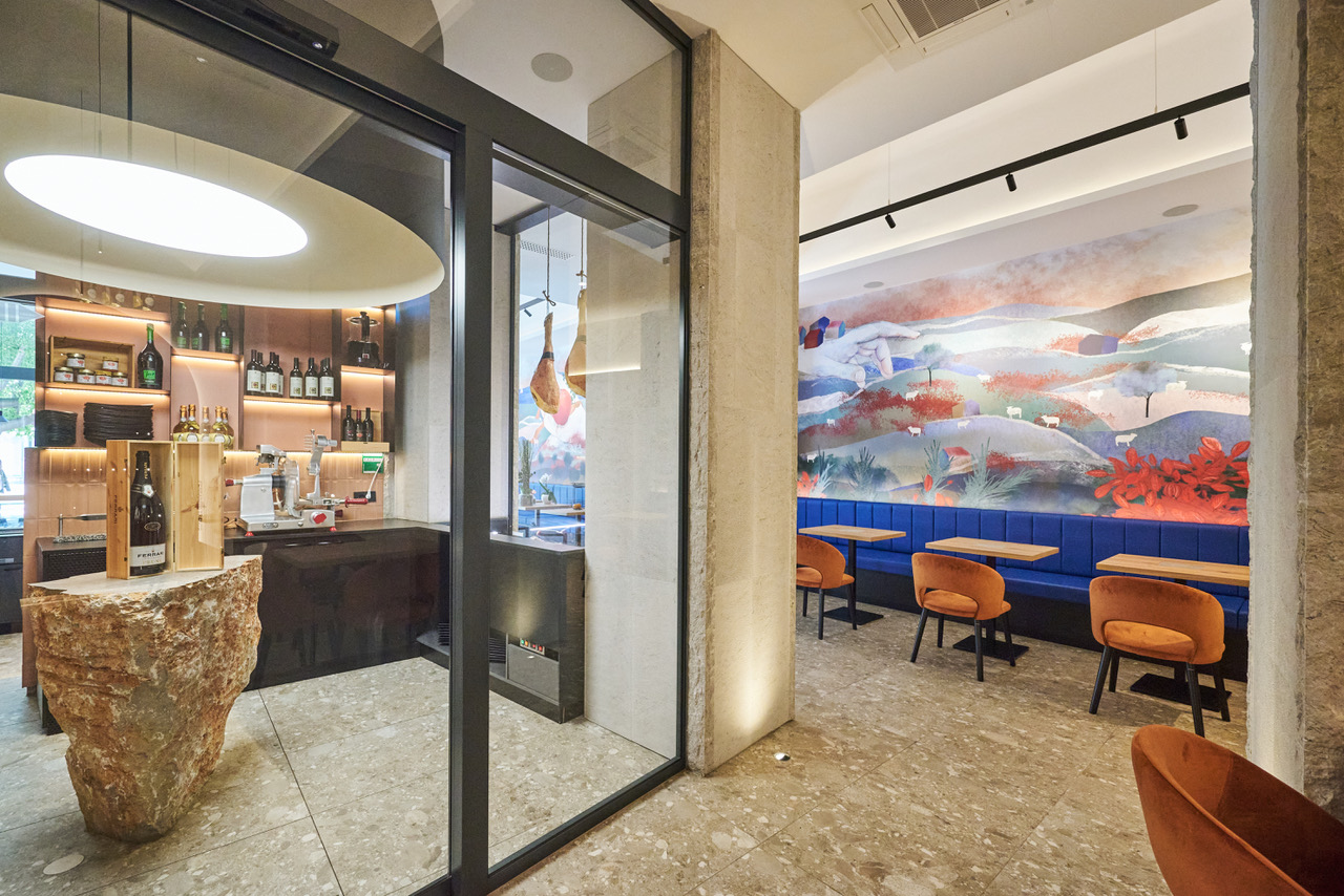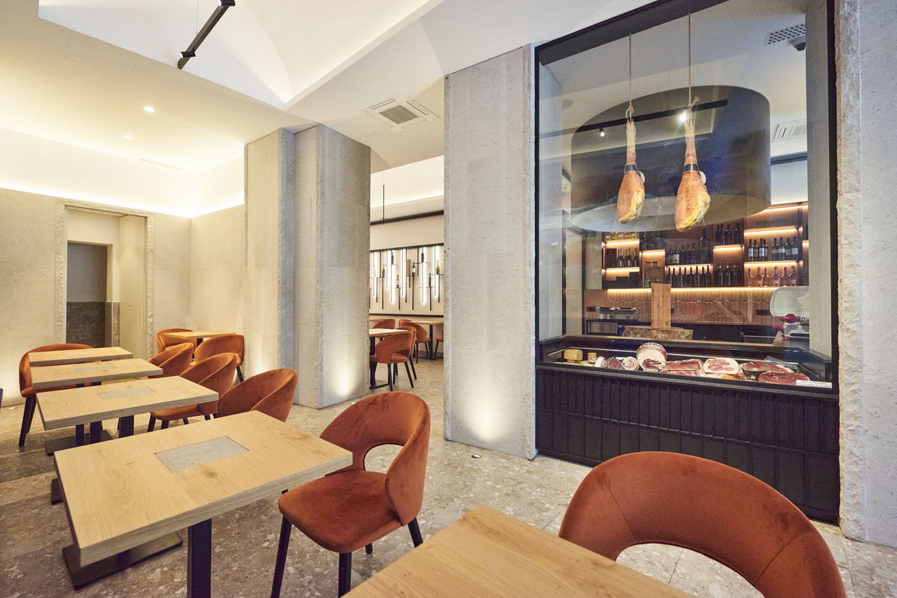 V središču lokala sta izložba pršutov in mesnin, s katero se avtorica pokloni bližnji tržnici in trgovskemu značaju tržaške četrti, ter osrednji element, grobo izklesan kamnit podstavek, na katerem je, kot na oltarju, izpostavljeno kraško bogastvo, dobro vino in pršut.