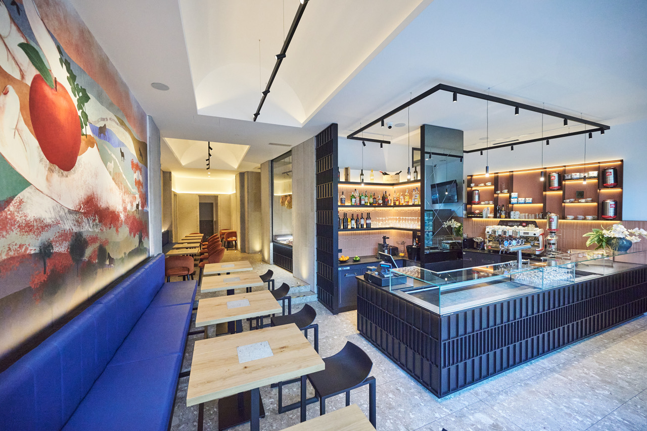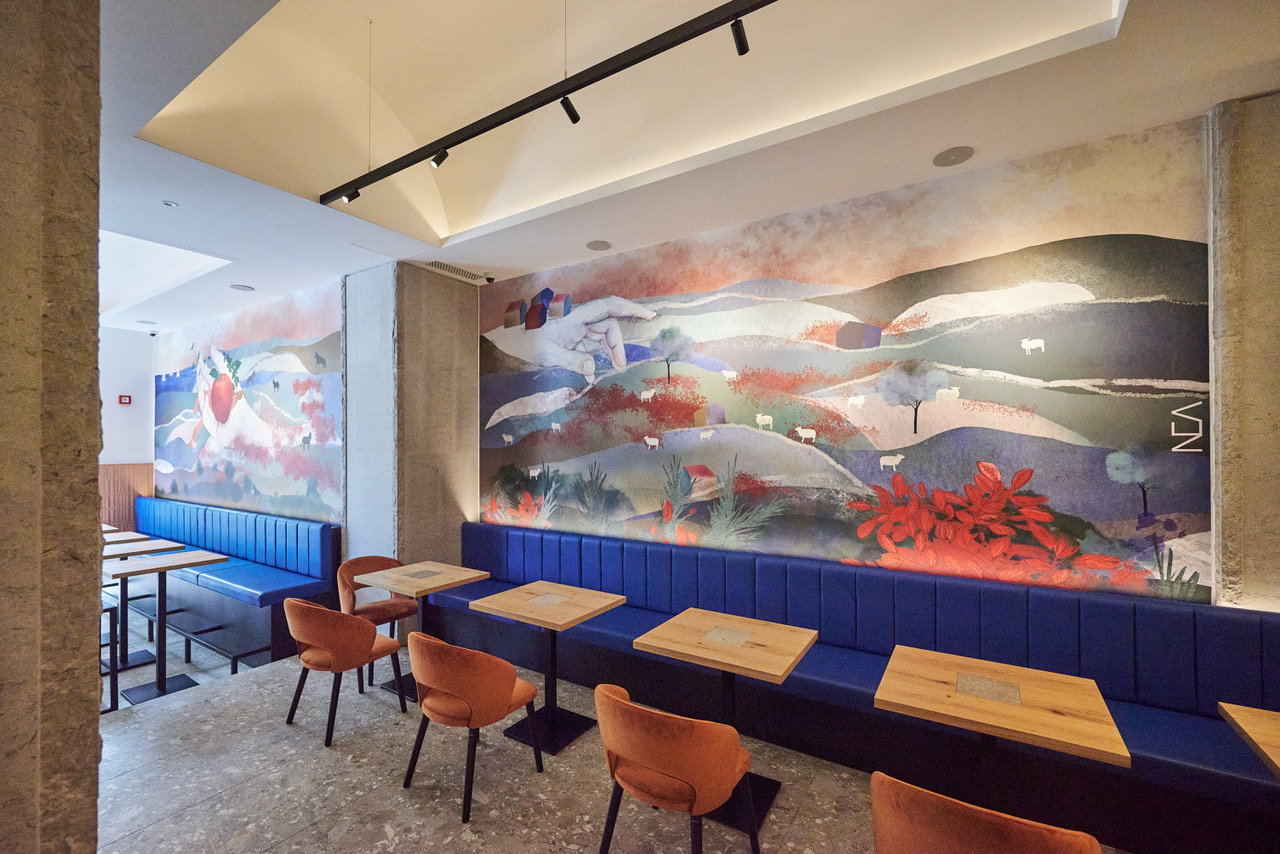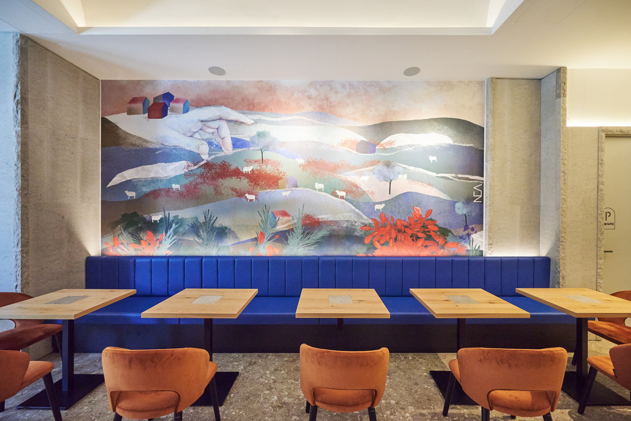 Barvna shema nas popelje od rdečih tonov terre rose in sivin kraškega kamna do intenzivne morsko modre barve Trsta. Tem barvam in temam sledi tudi unikatna stenska ilustracija, ki jo je izdelala slovenska ilustratorka Nea Likar.