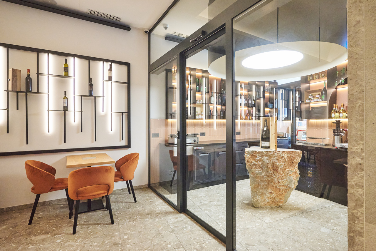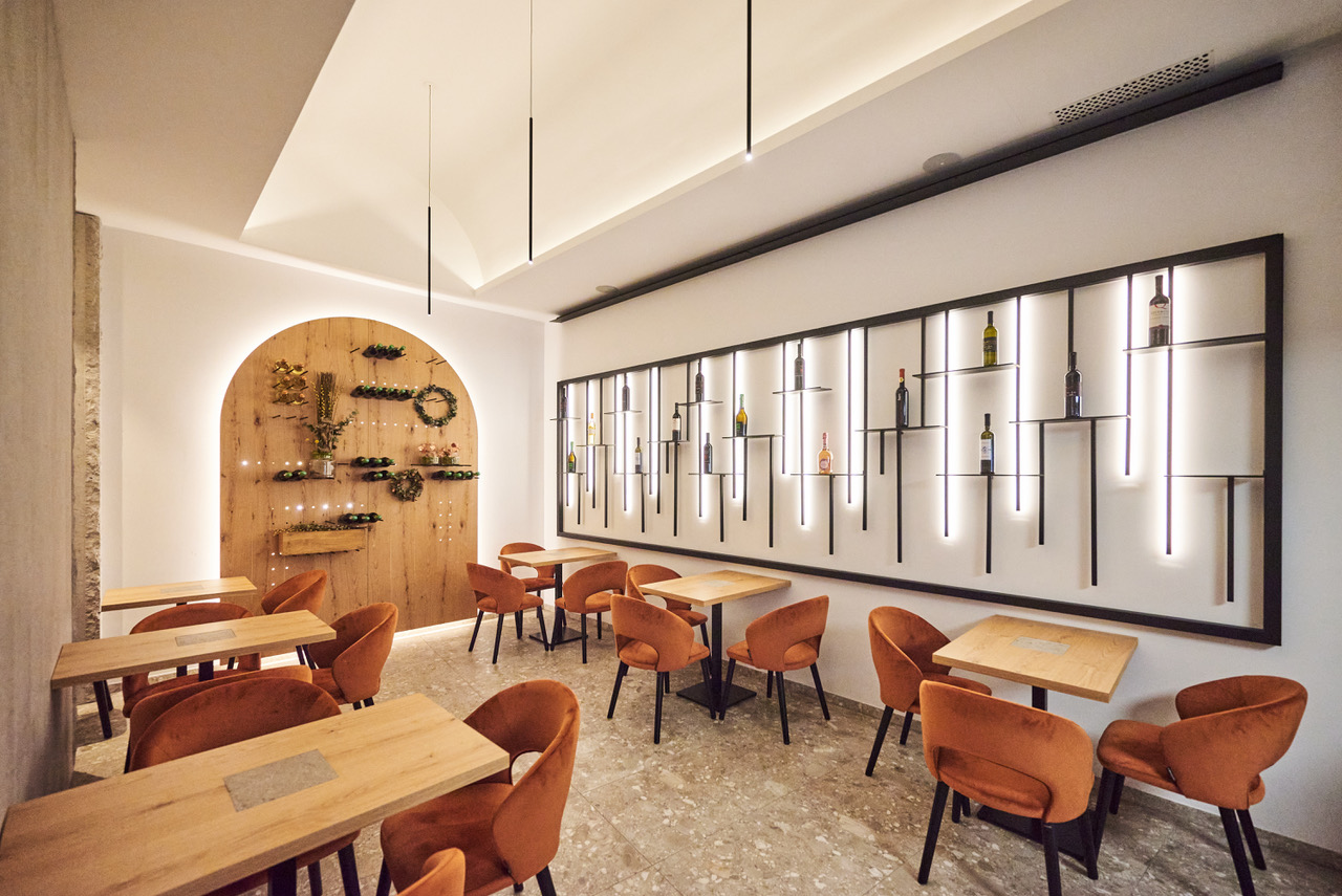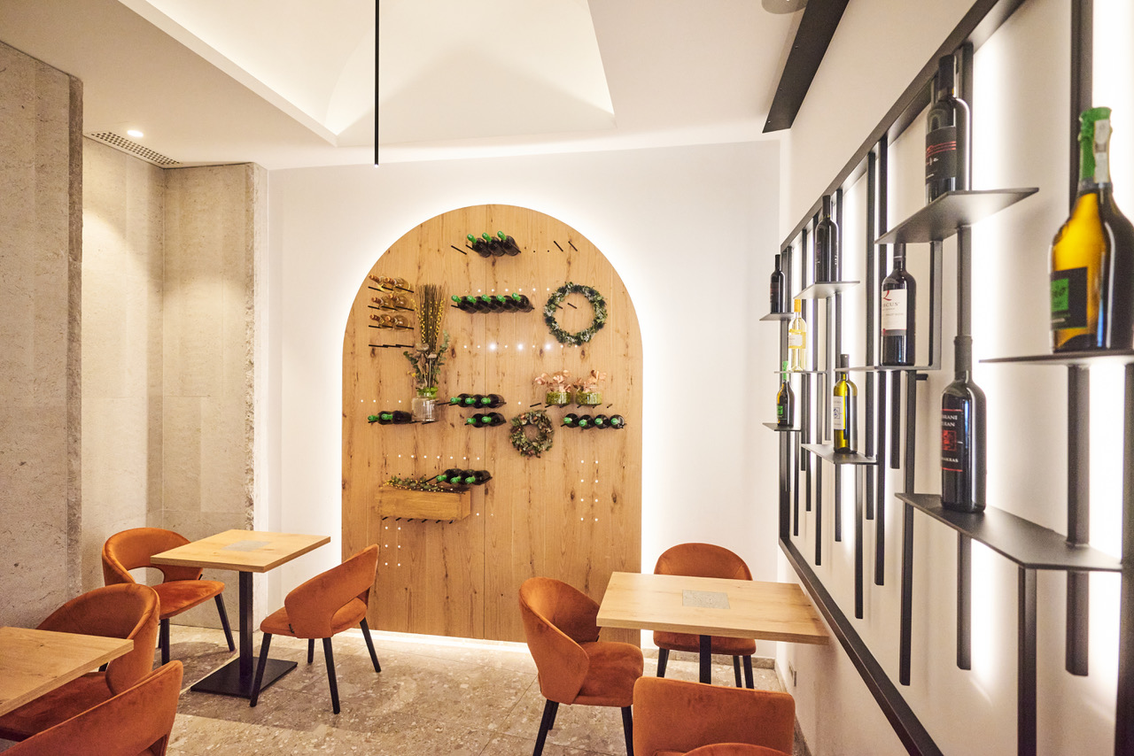 Ambienti v lokalu se stopnjujejo in nadgrajujejo; vstopni del je tipično barski, za značilno tržaško stoječe pitje kave ob šanku. Temu sledi domiselno izkoriščena višinska razlika dveh stopnic za razdelitev lokala na visoke barske mize s stoli in nizke mize z oblazinjenimi stoli v notranjosti bara. Po najdaljši steni poteka intenzivno modra oblazinjena klop pod stenskim muralom, vertikalni poudarki v lokalu pa so izvedeni v značilnem kraškem kamnu. Zadnji, najintimnejši prostor spominja na sodobno vinsko klet, z regalom za steklenice, kamnito stranico in leseno oblogo v obliki lesenih vrat, ki zaokrožijo vtis »kraškega hrama«.