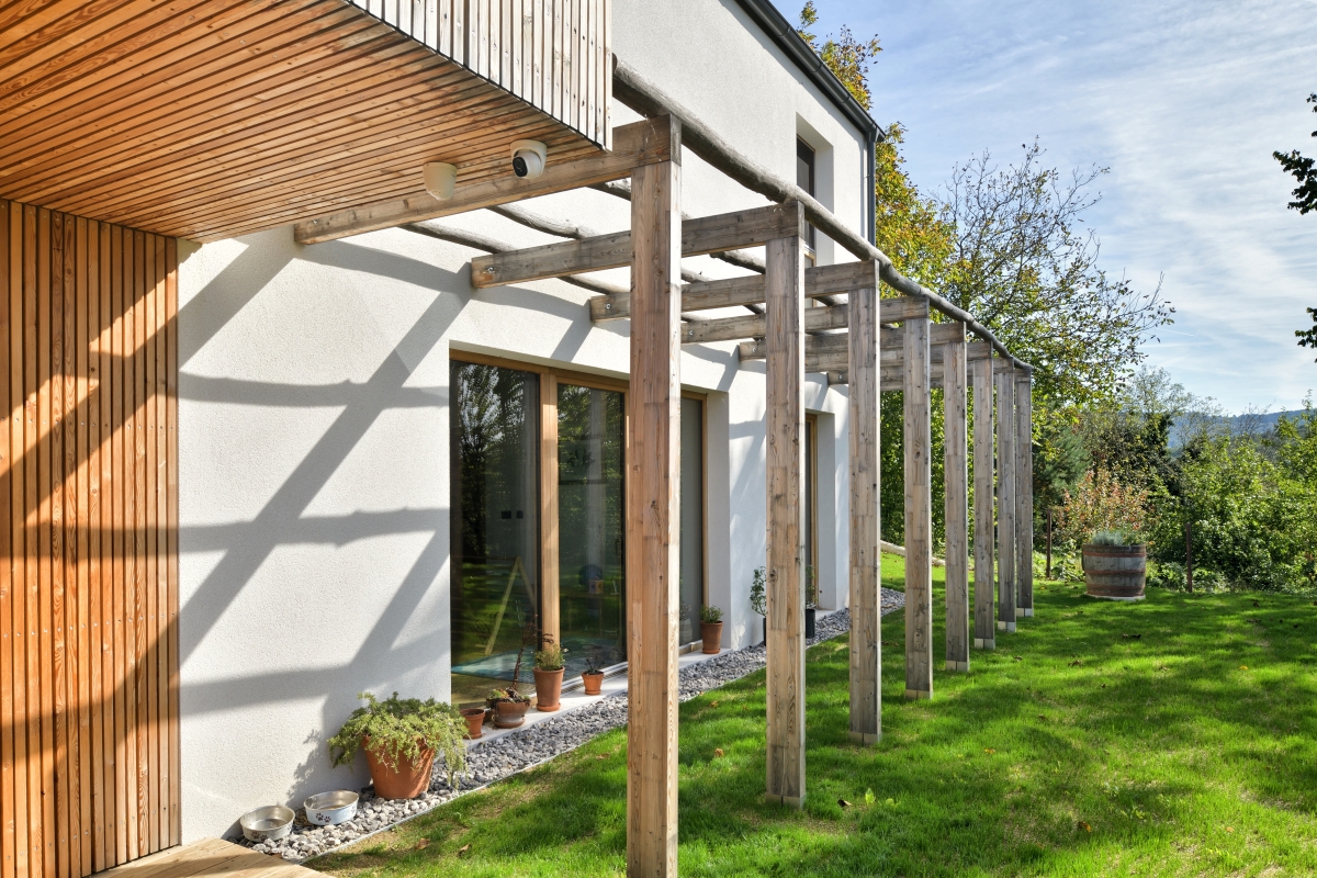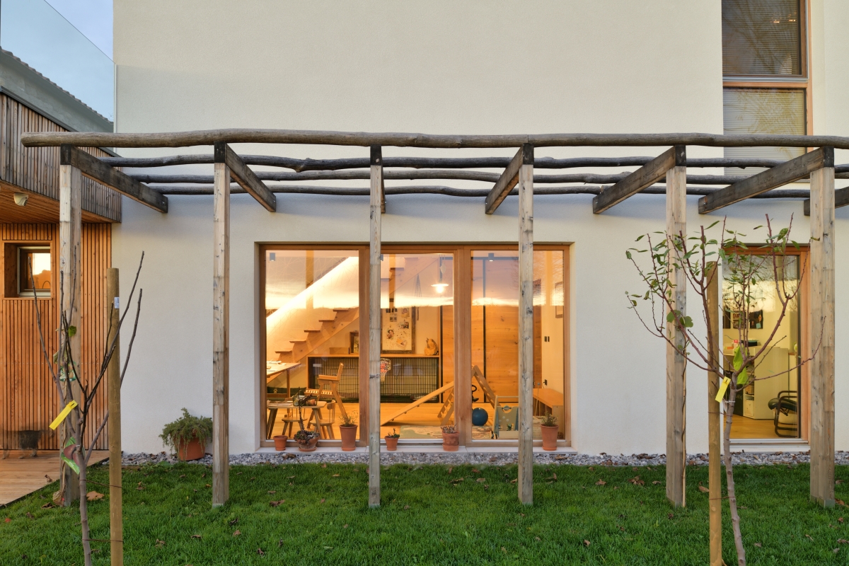 Nadstrešnica za dva avtomobila je umaknjena na rob parcele, vkopana v teren, skriva pa tudi manjšo vinsko klet in shrambo. Na strehi tega pomožnega objekta so predvideni tudi fotovoltaični paneli, ki na tem mestu ne bodo krnili strešne krajine kraške vasice.