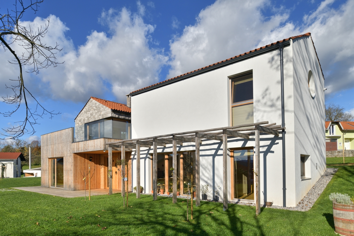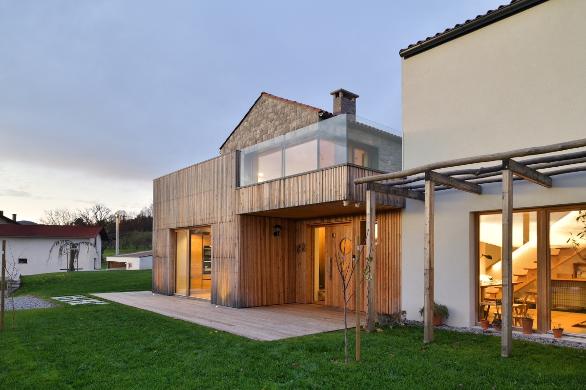 Novo hišo pravzaprav sestavljata dve – dva volumna s položno dvokapnico, rekonstruiran obstoječi in novozgrajeni, prvi ometan, drugi oblečen v plašč iz lokalnega kraškega kamna. Umestitev nove hiše je bila pogojena z lego obstoječe. Mansardni del in ostrešje obstoječe hiše se je odstranilo in zgradilo na novo, pritlični del pa se je navezal na novozgrajeni del hiše. Dve hiški sta druga od druge odmaknjeni in povezani s kubusnim pritličnim delom, prekritim z lesom, ki se delno ovije okoli novega poslopja.
