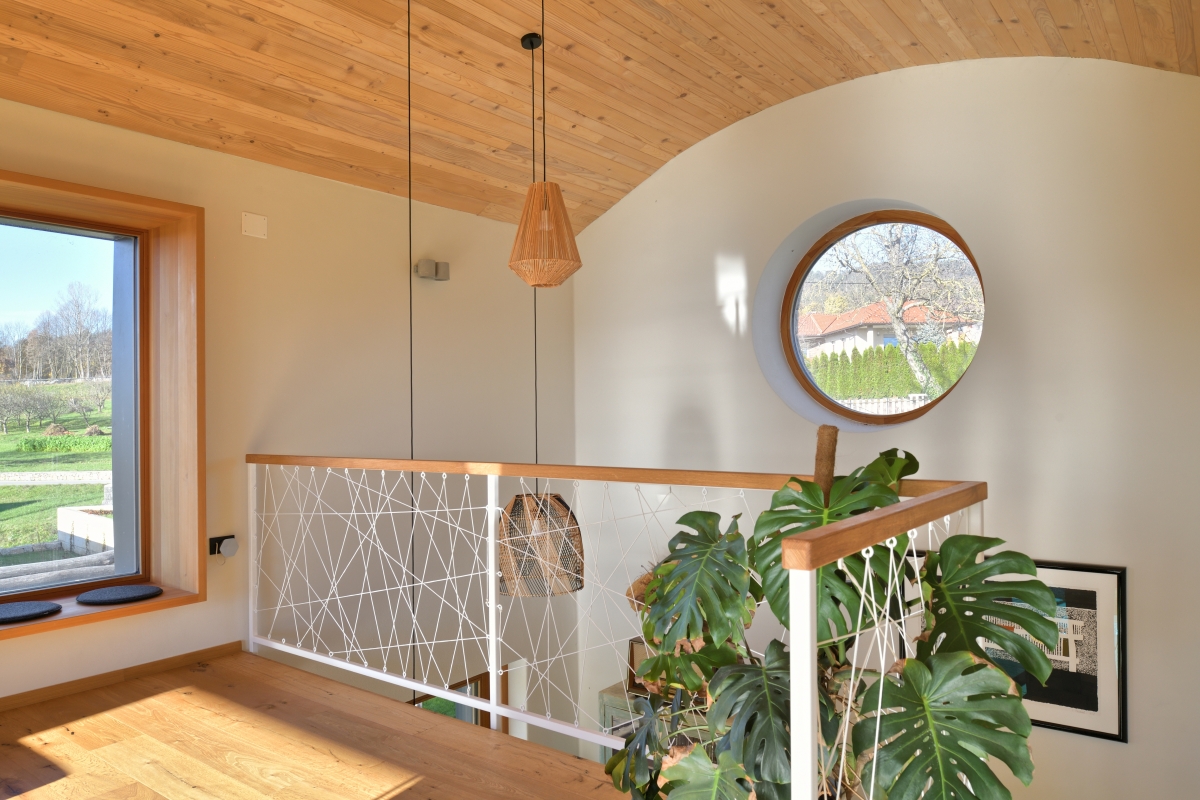 Posebnost hiše sta okrogli okni v zatrepih obeh delov hiše, ki v sebi nosita družinsko zgodovino. Majhno okroglo okno je bilo namreč vgrajeno že v stari hiši, kamor je bilo s stare barke prineseno v spomin na morje. Okno se je naročnikoma močno priljubilo, ta element sta si želela uporabiti tudi v novi hiši, arhitekt pa je poiskal pravo mesto zanj. »Včasih, ko se umiriš in se zazreš skozi okroglo okno, je tudi hiša kakor barka, ki se giblje skozi pokrajino letnih časov,« razmišlja.