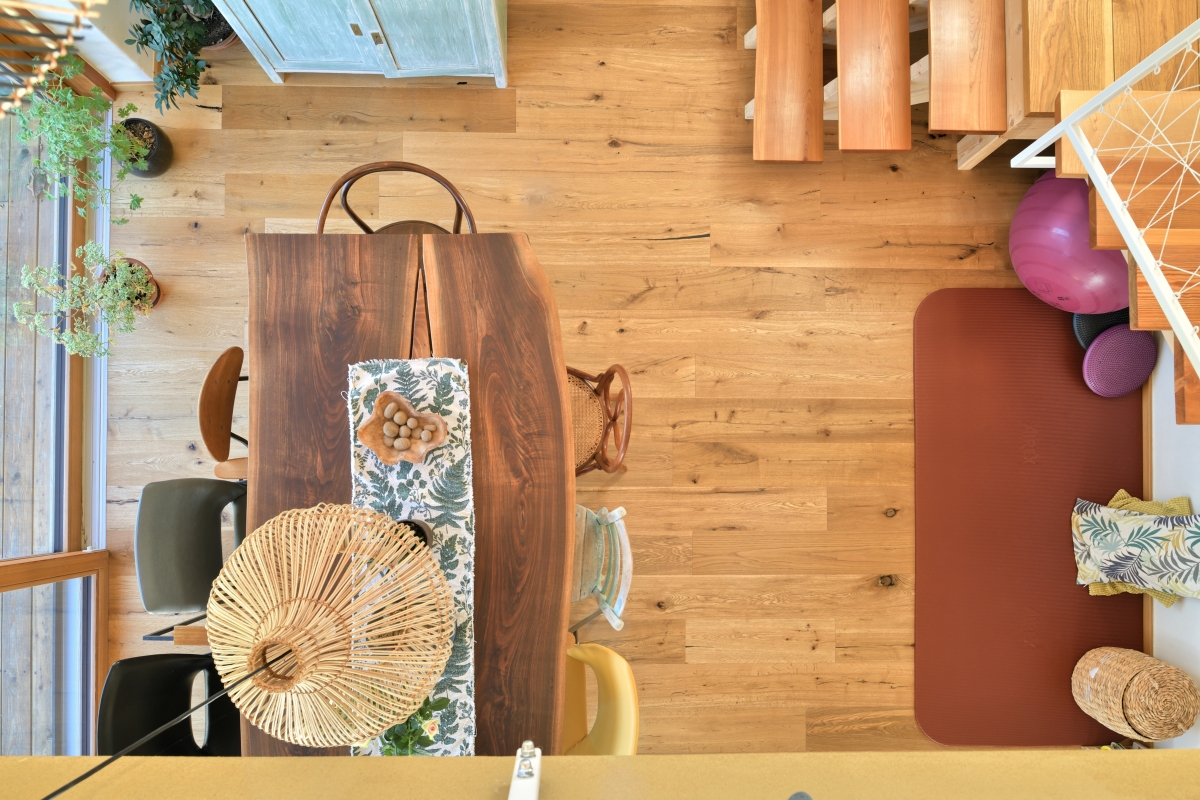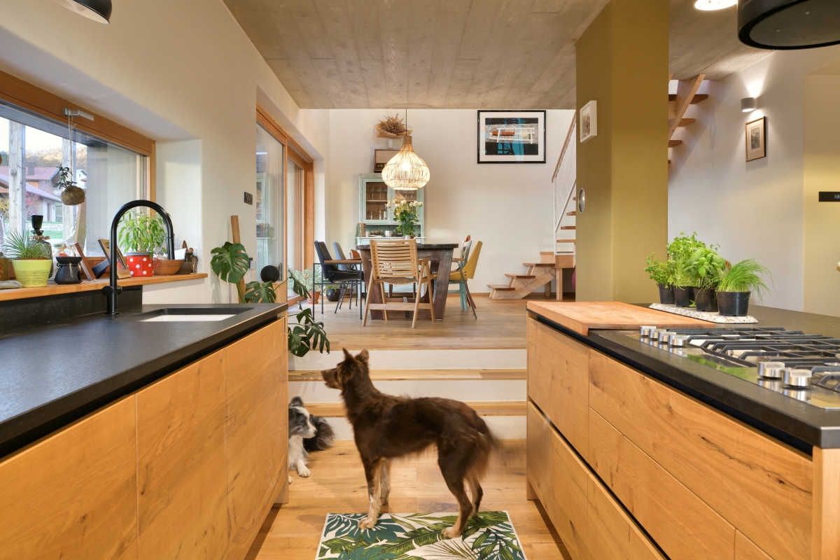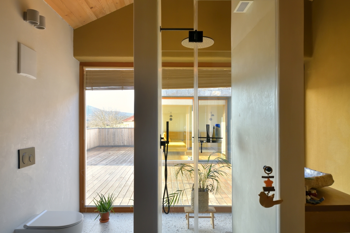 Vsi prostori bivalnega dela hiše se odpirajo v okolico preko teras, ki v toplem delu leta predstavljajo zunanji podaljšek notranjega prostora. Najlepši pogledi na okoliško krajino so prihranjeni dvignjeni terasi pred dnevno sobo, ki je prav zato tudi pomaknjena v nadstropje, medtem ko je pritličje prepuščeno kuhinji in jedilnici. »Odprta pokrajina preide v odprt tloris, ki stanovalcu daje občutek povezanosti z okoljem – naravo, hkrati pa nudi potrebno intimo,« razlaga Veselko.