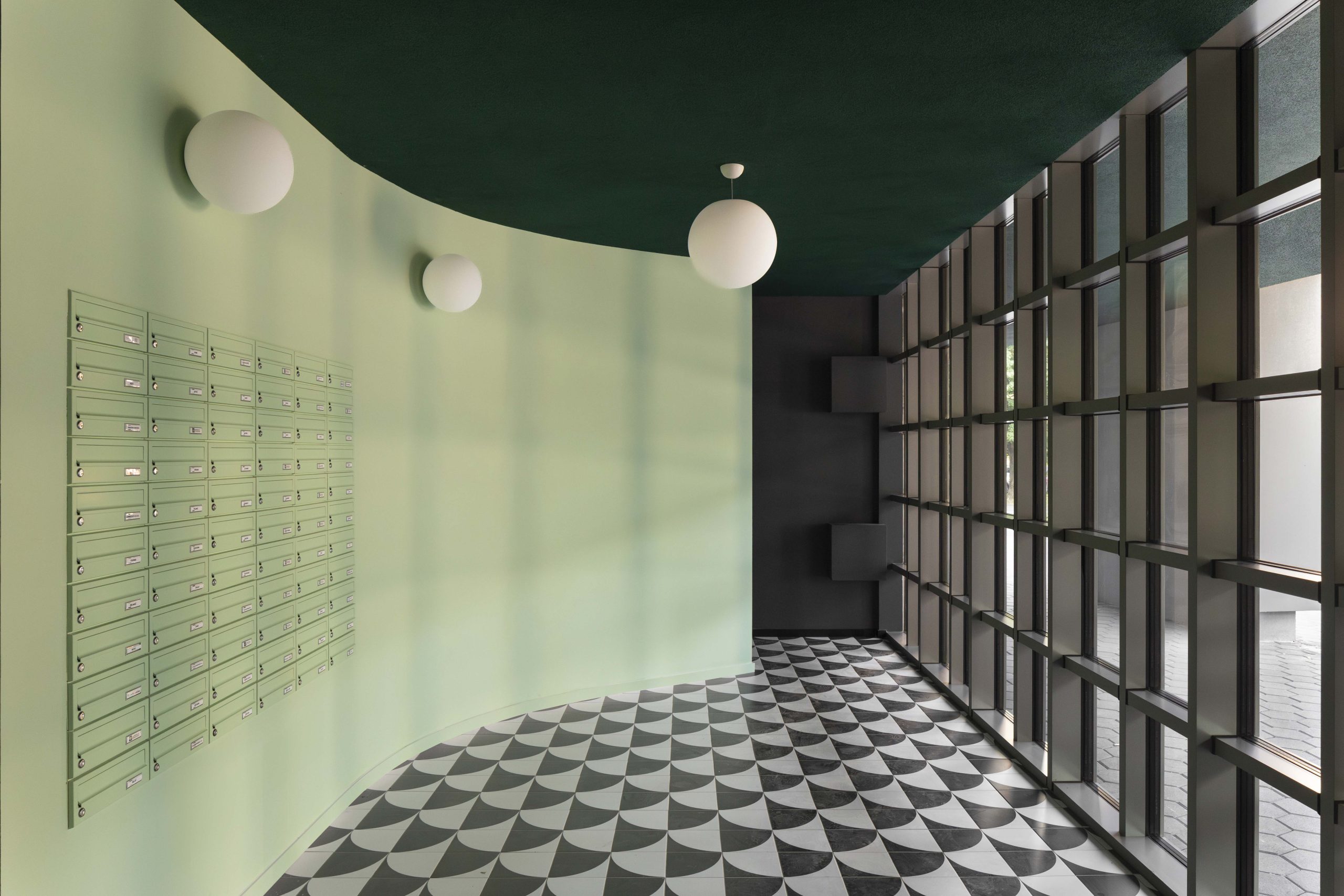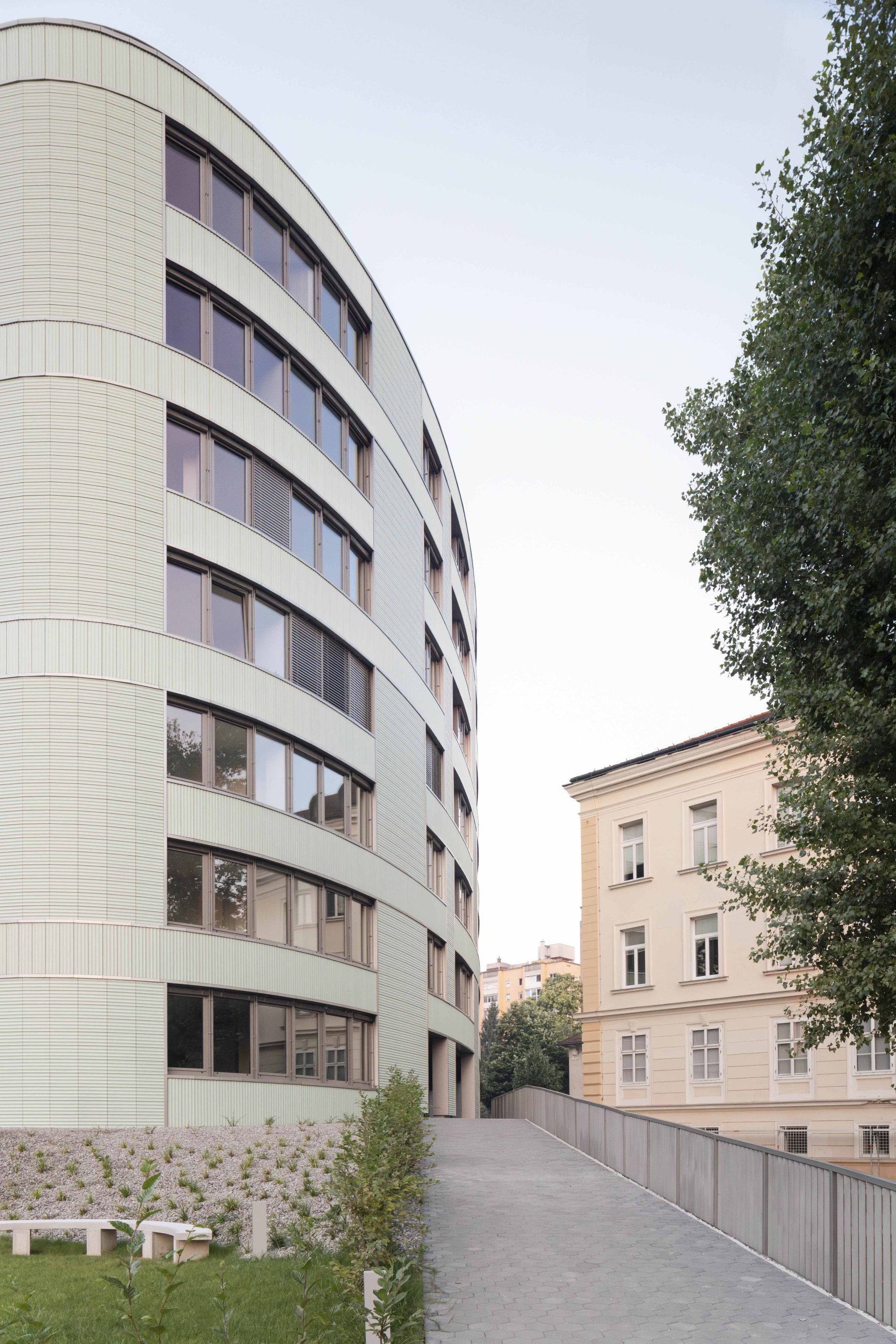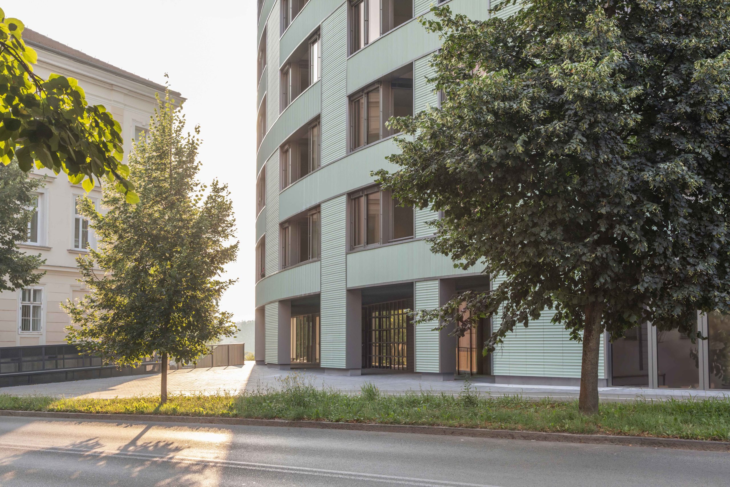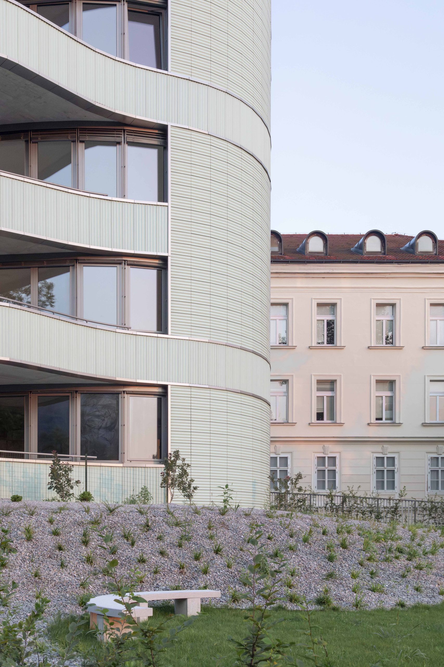 Nova stanovanjska stavba je na trikotni lokaciji obdana z raznolikimi, odprtimi in vključujočimi javnimi prostori. Na stičišču notranjega mestnega obroča, historične šolske stavbe in nove stavbe je ustvarjena vhodna plaza, ki se nadaljuje do pokritih arkad z več vhodi v stavbo. Na vzhodnem delu parcele je zasnovan vrt z otroškim igriščem. Na južnem delu poteka promenada ob rečnem kanalu, ki povezuje stavbo z bližnjo sosesko. Tukaj so tudi garažni in servisni vhodi.