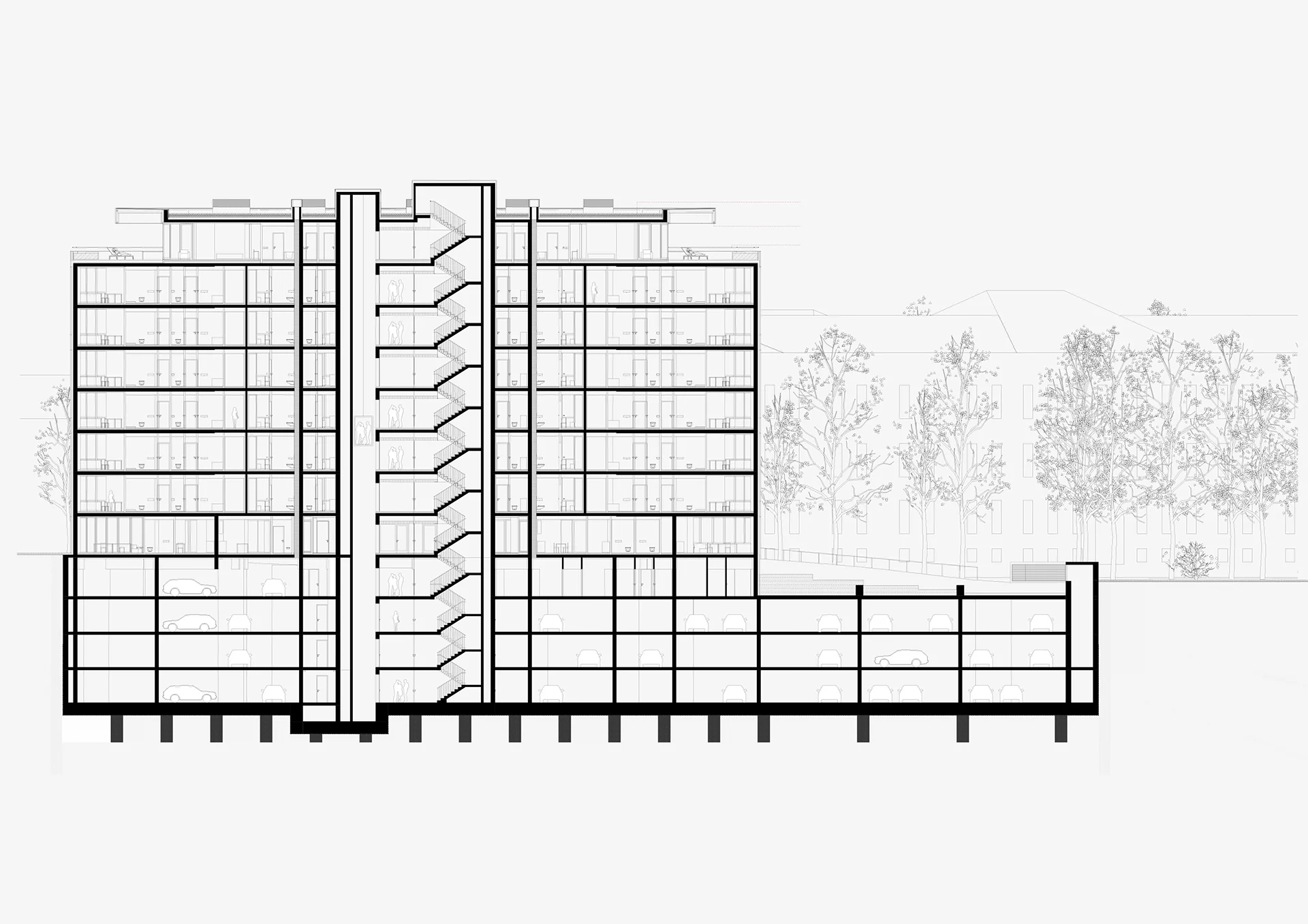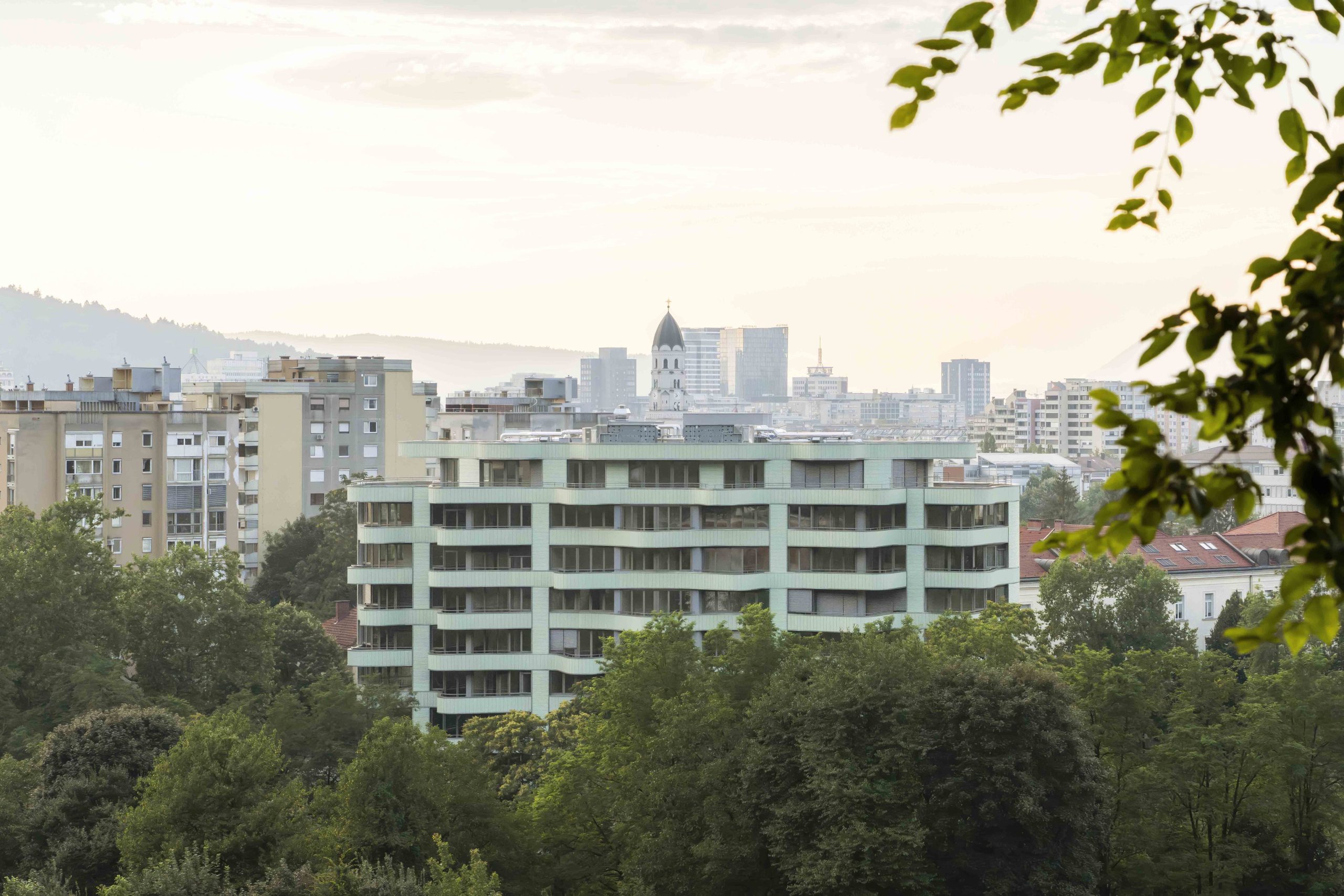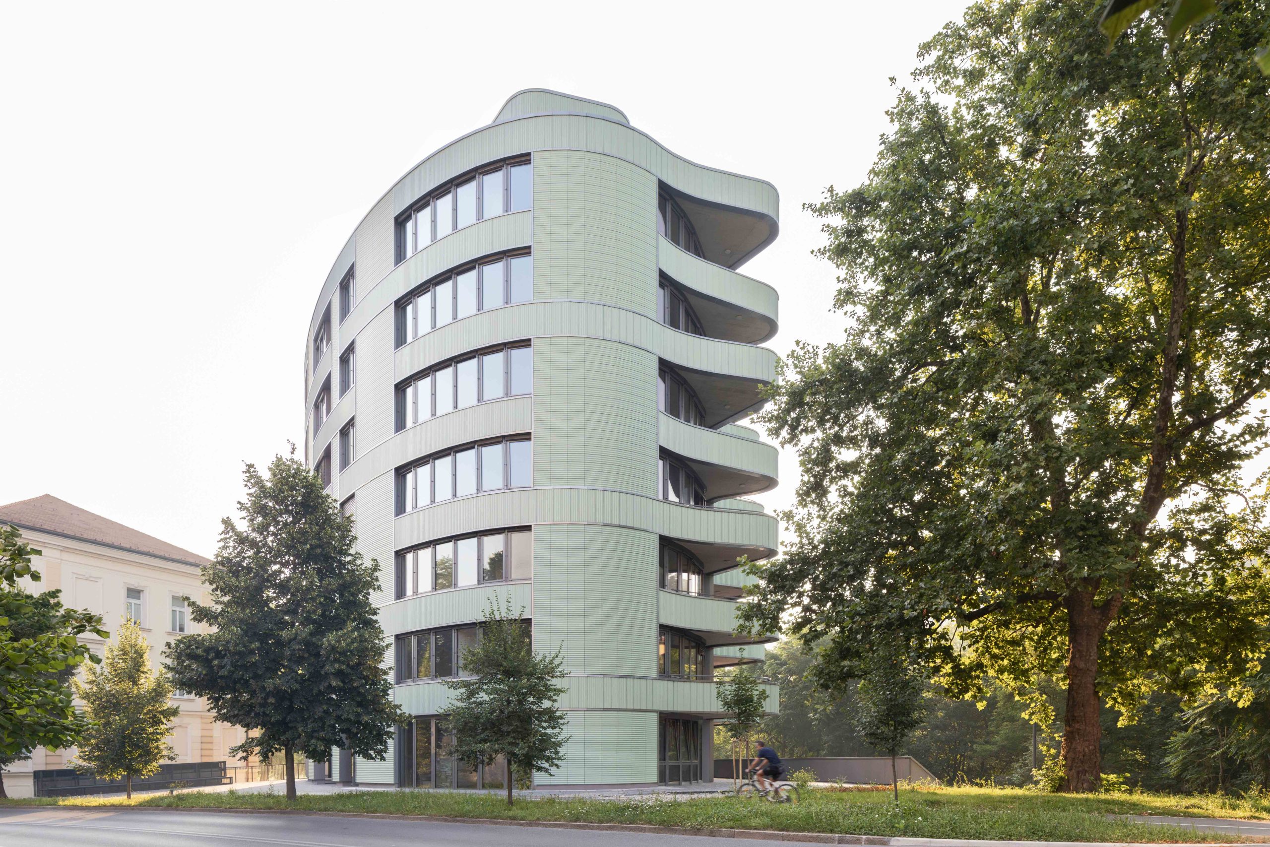 Nova stanovanjska stavba je na trikotni lokaciji obdana z raznolikimi, odprtimi in vključujočimi javnimi prostori. Na stičišču notranjega mestnega obroča, historične šolske stavbe in nove stavbe je ustvarjena vhodna plaza, ki se nadaljuje do pokritih arkad z več vhodi v stavbo. Na vzhodnem delu parcele je zasnovan vrt z otroškim igriščem. Na južnem delu poteka promenada ob rečnem kanalu, ki povezuje stavbo z bližnjo sosesko. Tukaj so tudi garažni in servisni vhodi.