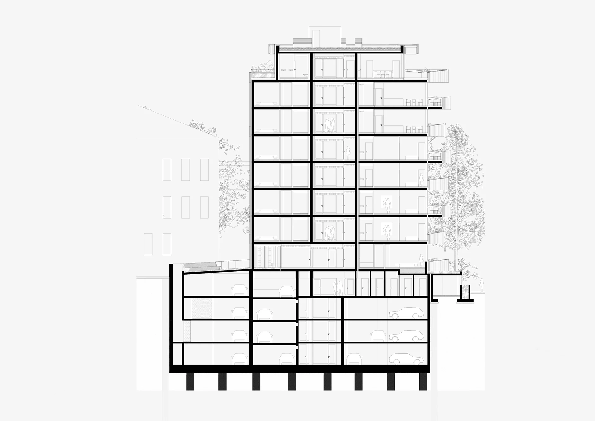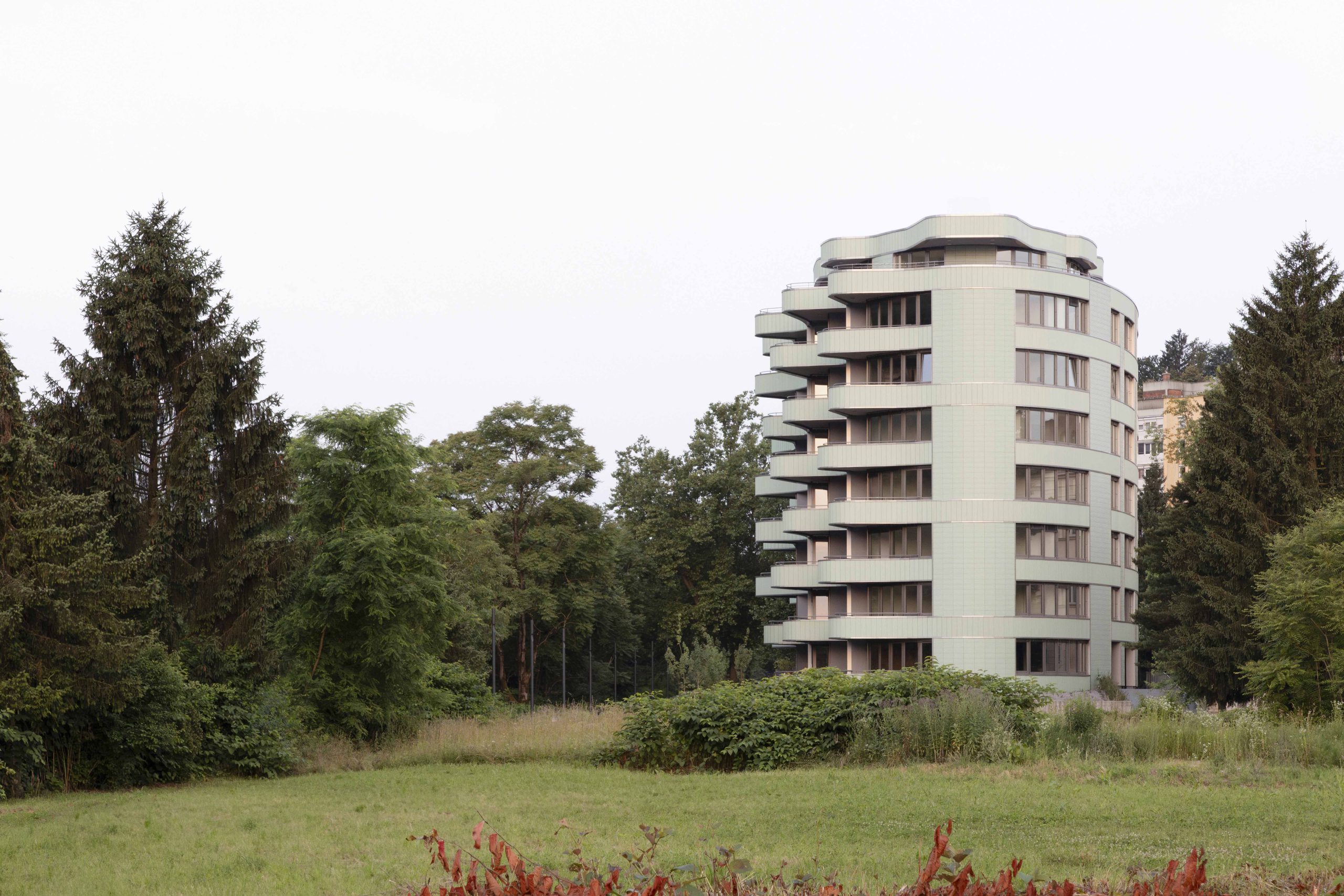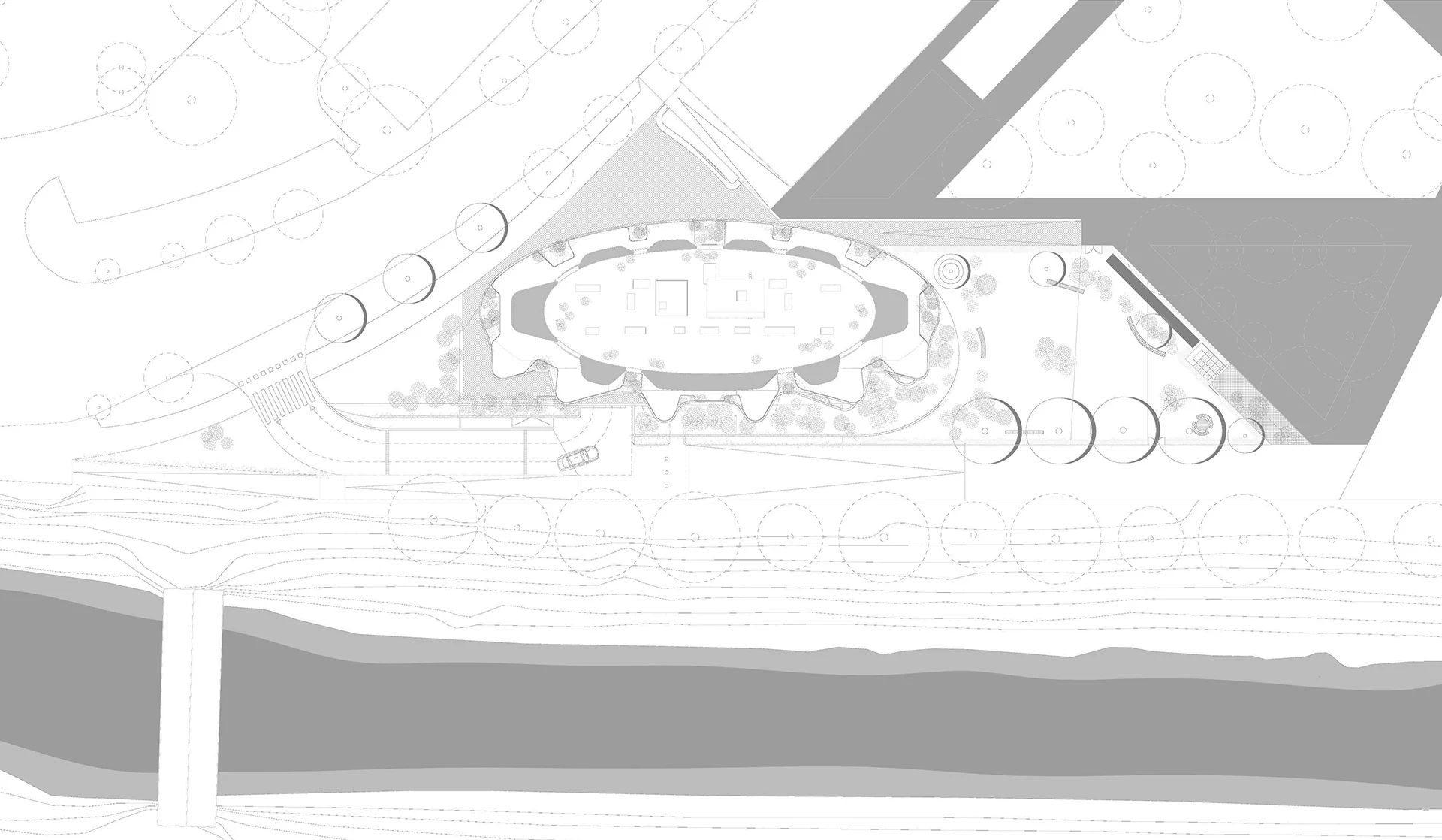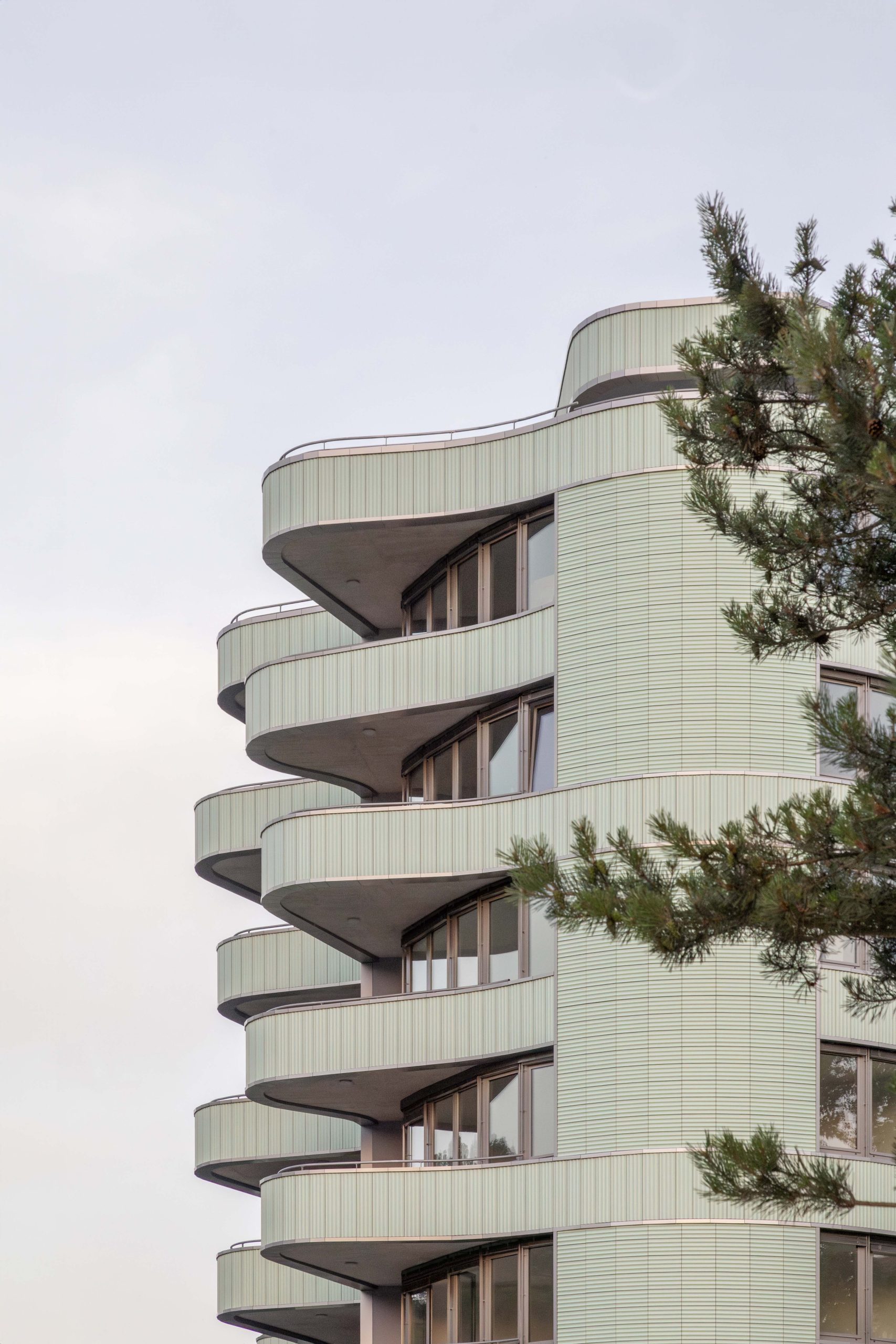 Nova stanovanjska stavba je na trikotni lokaciji obdana z raznolikimi, odprtimi in vključujočimi javnimi prostori. Na stičišču notranjega mestnega obroča, historične šolske stavbe in nove stavbe je ustvarjena vhodna plaza, ki se nadaljuje do pokritih arkad z več vhodi v stavbo. Na vzhodnem delu parcele je zasnovan vrt z otroškim igriščem. Na južnem delu poteka promenada ob rečnem kanalu, ki povezuje stavbo z bližnjo sosesko. Tukaj so tudi garažni in servisni vhodi.