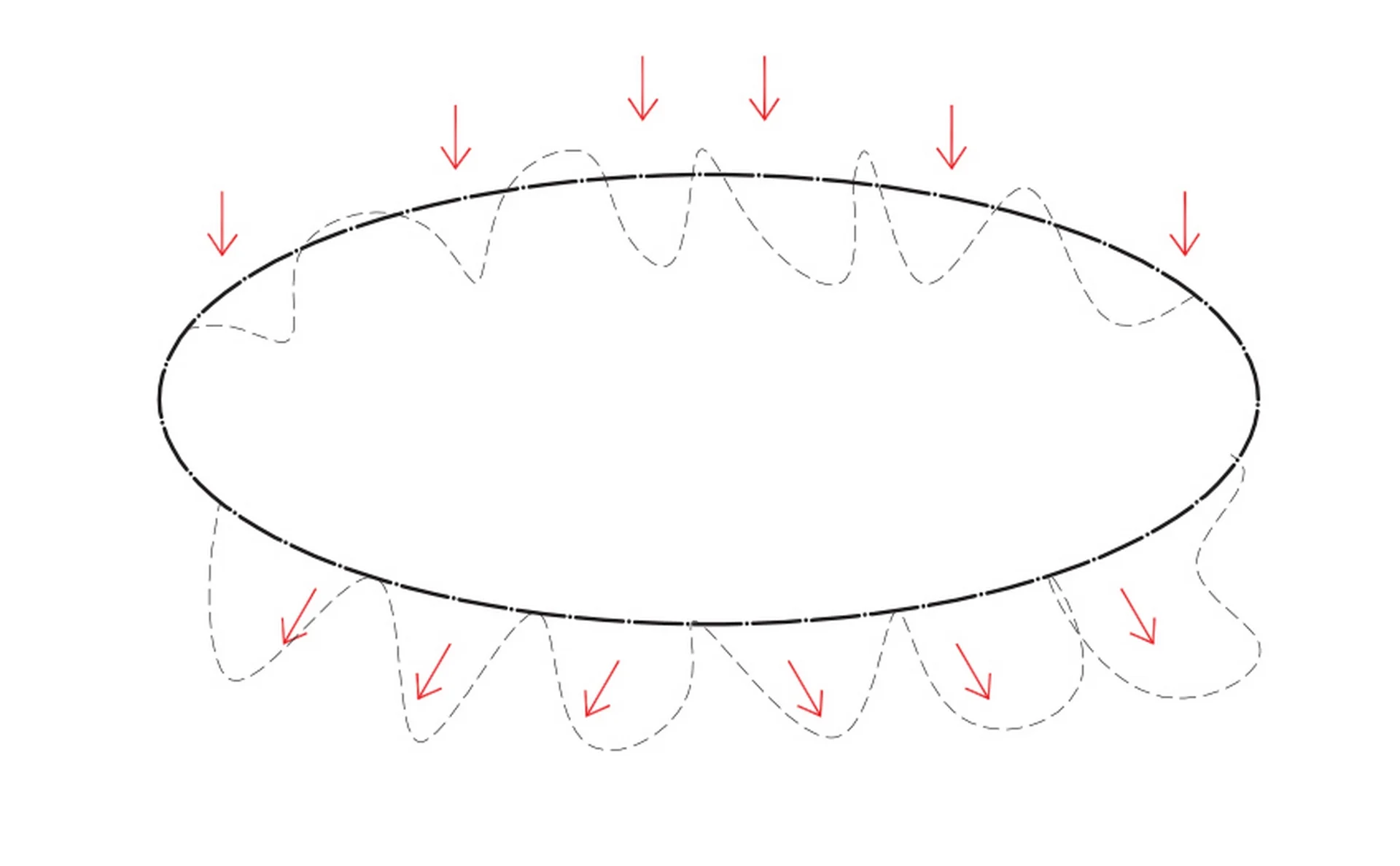 Elipsa ima izrazit dvojni značaj: severna stran je umirjena in kontinentalna, južna pa živahna in mediteranska. Ta dvojnost se navezuje na lokacijo ob Fabianijevem notranjem mestnem ringu in na umestitev Ljubljane kot mesta, zaznamovanega z razkošnim mediteranskim življenjem na prostem ter strožjo dunajsko stanovanjsko arhitekturo. Fasada stavbe je obložena s trakovi mint zelenih valovitih keramičnih ploščic, ki spominjajo na tekstilni vzorec, poudarjen z vertikalnimi in horizontalnimi linijami. Balkoni delujejo kot horizontalni trakovi, ki se od ravnine fasade raztezajo proti Golovcu.