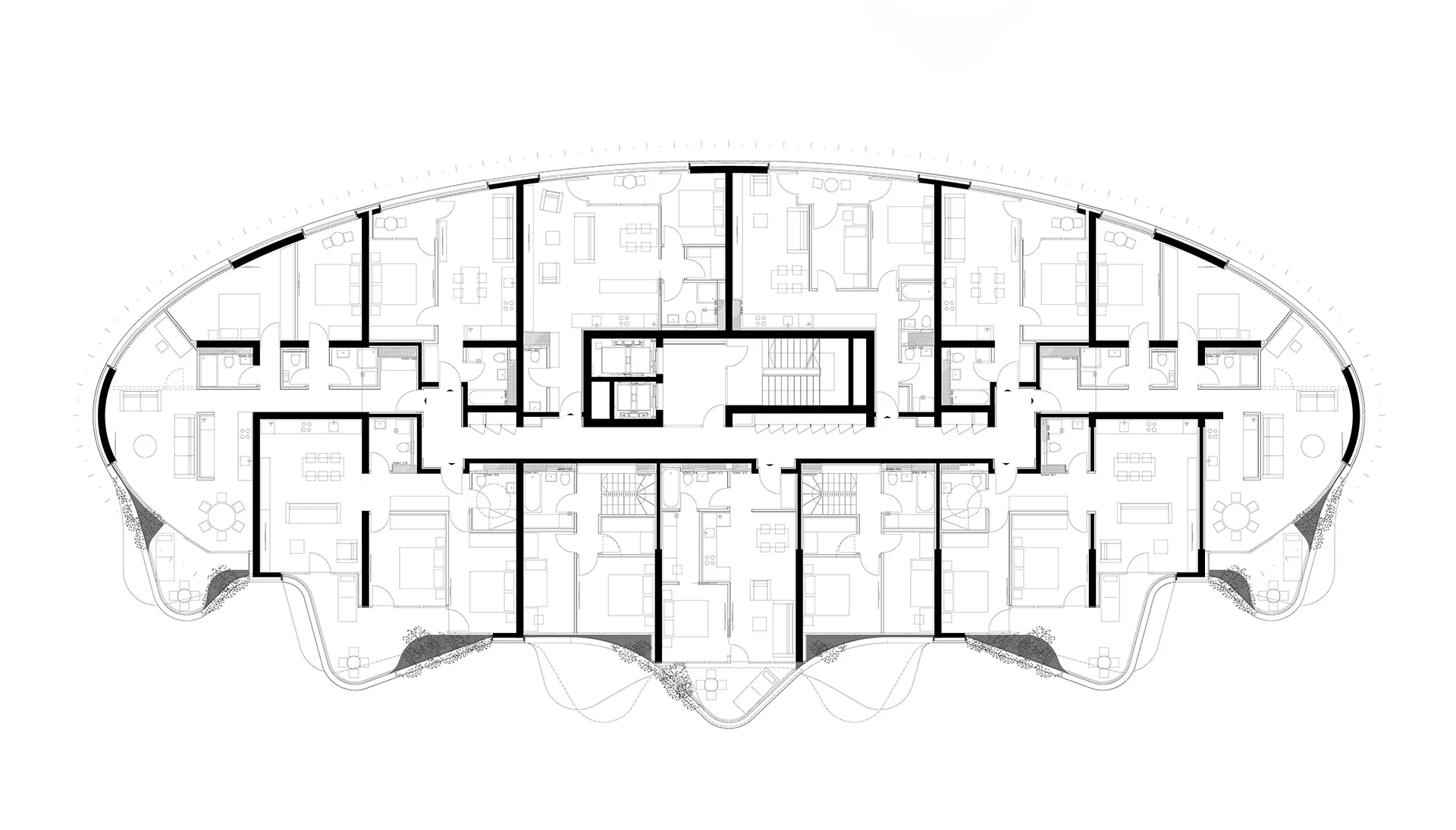 V Elipsi je 64 stanovanj različnih velikosti in z različnim odnosom do zunanjega prostora. Eliptična oblika omogoča tudi različne tipologije, od mini loftov do dupleksov in klasičnih hodnik-soba stanovanj. Visoko prilagodljivost omogoča konstrukcijski sistem stavbe. Stanovanja se močno razlikujejo – od enosobnih stanovanj z ložo do penthouseov z velikimi strešnimi terasami. Na severni strani se vsaka soba znotraj manjšega stanovanja odpira na ložo, kar omogoča krožno prezračevanje. Prostorni, valoviti balkoni definirajo južno stran eliptičnega volumna, kjer vgrajena korita z rastlinami zagotavljajo zasebnost in dopolnjujejo poglede na okoliške zelene hribe.