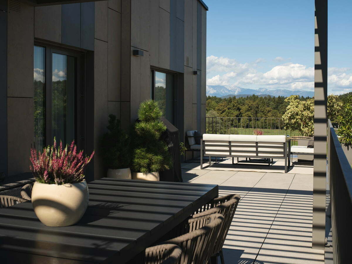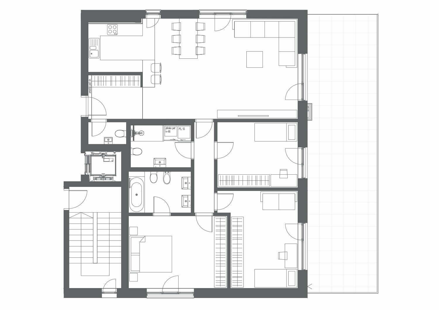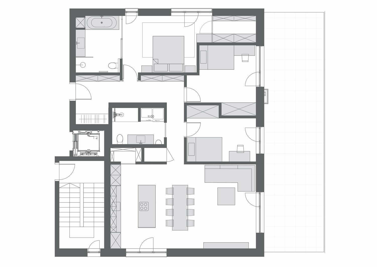 Arhitektka je tako veliko pozornosti posvetila tlorisni zasnovi, ki jo je načrtovala povsem na novo in jo v skladu z izhodiščno odločitvijo obrnila na glavo. To je ob že določeni poziciji vhoda sicer pomenilo tudi daljši hodnik, ki pa je osmišljen kot razstavni prostor za umetnine in spominke. Večina sob se odpira na prostrano teraso vzdolž celotne vzhodne fasade, ki zaradi velike površine ustvarja iluzijo pritličnega stanovanja.