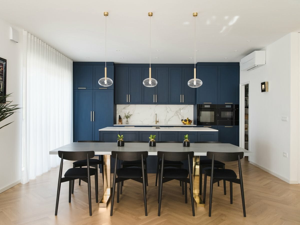 Slog stanovanja izhaja iz jasno zastavljenih izhodišč naročnice. Med temi je bila denimo modra kuhinja z zlatimi detajli, ki je pomenila osnovo nadaljnjega tkanja povezane likovne podobe stanovanja. Svetla, a hladna barvna paleta in preprosti detajli v zloščen meščanski ambient vnašajo pridih severne Evrope.