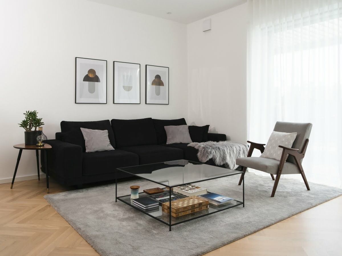 Premišljeno vstavljeni vgradni kosi pohištva omogočajo optimalno izrabo bivalnih površin. Tudi ostala oprema je večinoma narejena po meri, izstopata pa restavrirani počivalnik in steklena klubska mizica v dnevni sobi. Ker naročnika nista nikjer našla tako minimalistično dovršene mizice, kot sta jo želela, jima jo je na koncu izdelal in ob vselitvi podaril prijatelj, ki se ukvarja s kovinarstvom.