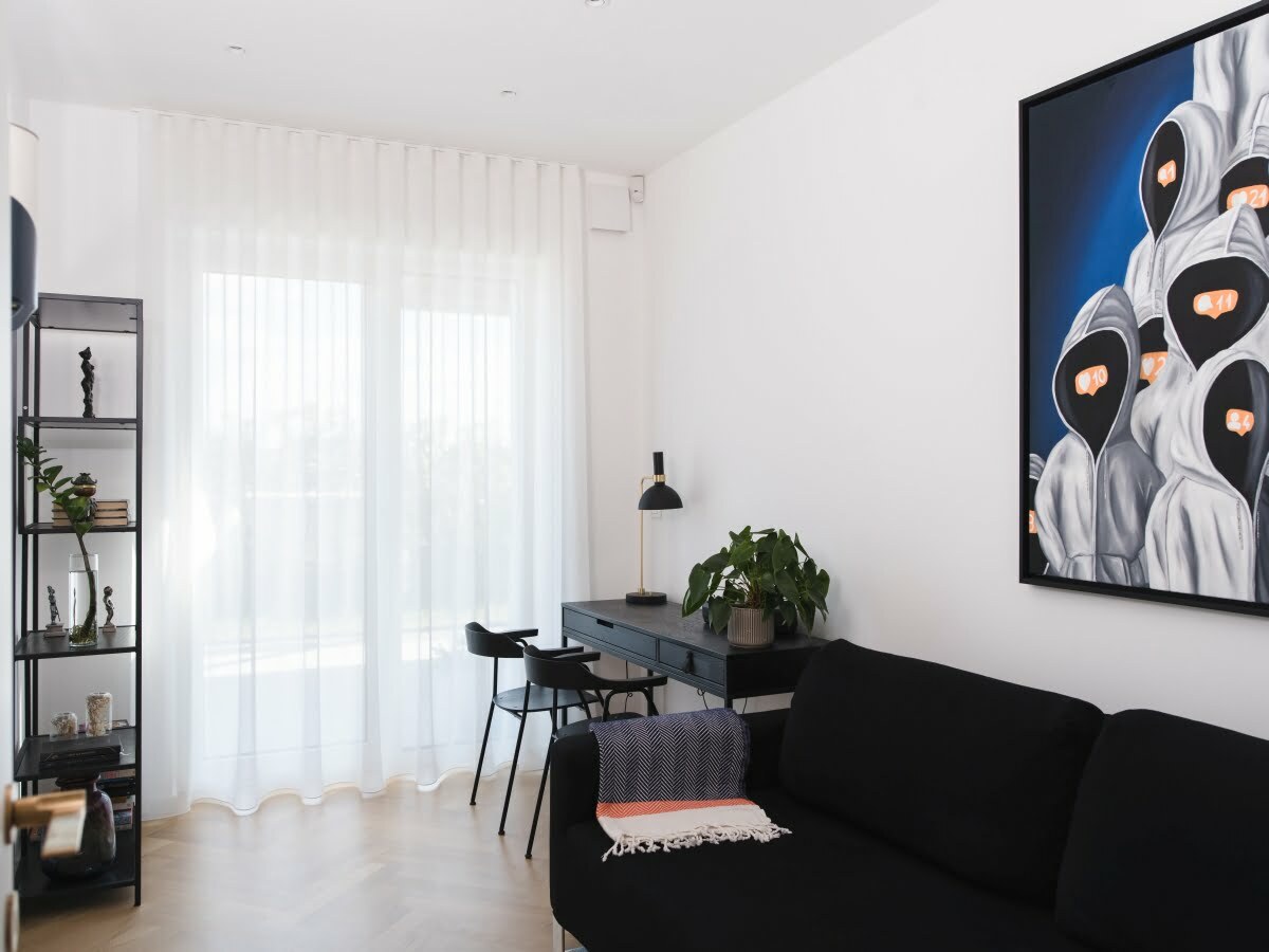 V novozgrajeni večstanovanjski stavbi v Ljubljani so se dnevni prostori velikega stanovanja v predvideni zasnovi ozirali proti goram na severni strani stavbe, a lastnika – mlad par – sta si želela dati prednost soncu v središču svojega novega doma. Še pred gradnjo se je naročnica tako obrnila na arhitektko Sanjo Premrn z željo, da bi jima prilagodila tloris in oblikovala interier.