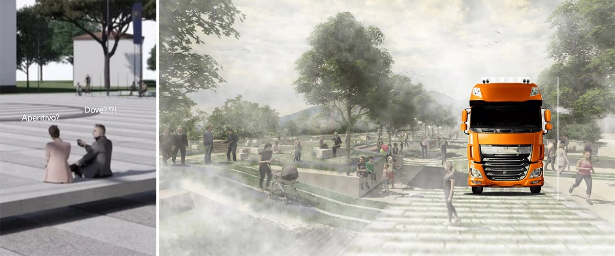 Zdaj pa na kratko analizirajmo končni projekt »Preureditev Piazzale della Transalpina/Trga Evrope in preureditev trizoba Maksa Fabianija – ulica G. Caprin, ulica U. Foscolo in ulica Luzzato«[1], za katerega je EZTS GO pooblastil kar šest različnih skupin strokovnjakov; med temi so arhitekturni biroji Ravnikar Potokar (Ljubljana), D:RH Studio in SAarchitetti (oba iz Benetk).[2]