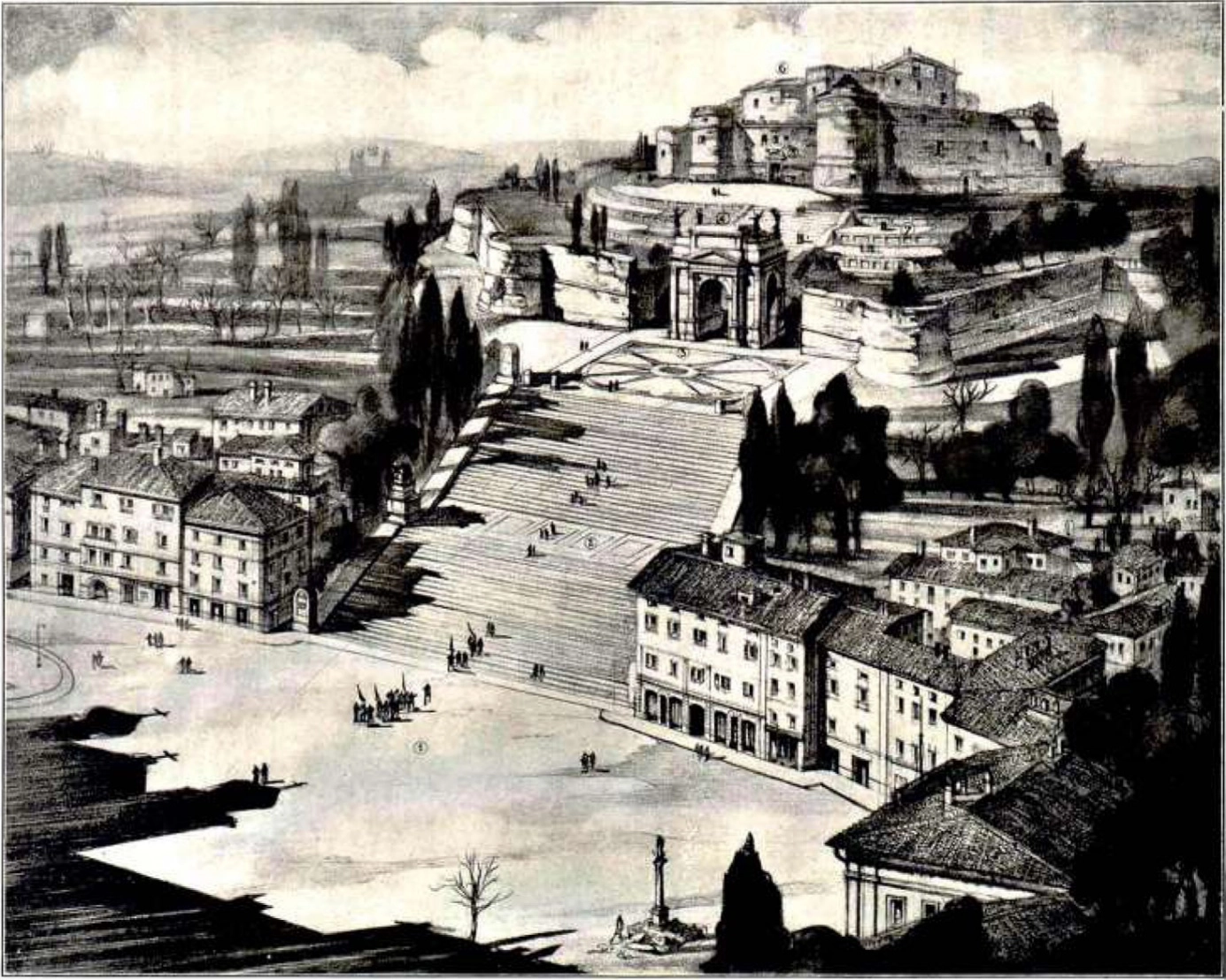 Ne krivim načrtovalcev, vendar me je predlog prenove bipolarnega trga spomnil na predlog rimskega arhitekta Armanda Brasinija iz leta 1923 za monumentalno in hkrati retorično stopnišče med trgom Piazza Vittoria in Goriškim gradom, ki bi ga pustili v ruševinah in ga uporabili za kostnico in muzej kot »narodni spomenik zmage« ali »spomenik pehotniku«.