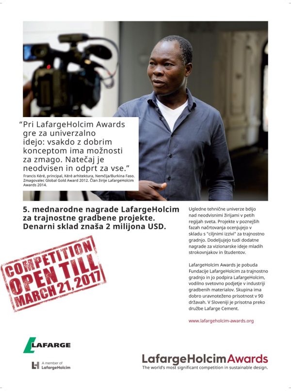 Diébédo Francis Kéré je zmagovalec natečaja fundacije Lafarge Holcim, v kategoriji Global Gold Award, leta 2012.