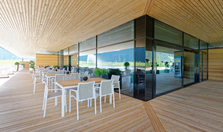 Da je bilo mogoče omogočiti enkraten pogled na Zillertalske Alpe in zelenico golf igrišča, so bile uporabljene velike steklene površine: približno 350 m² fasade in več kot 100 okenskih in vratnih elementov skupaj z velikimi drsnimi vrati zagotavlja prostran razgled. Posebna pozornost je bila namenjena sistemski združljivosti, da je vse elemente mogoče med seboj kombinirati in ustreči zahtevnemu načrtovanju. Tako je bilo okenski sistem heroal W 72 mogoče brez težav integrirati v fasadno rešitev heroal C 50 v obliki okvirske konstrukcije. Oba sistema izpolnjujeta najvišje zahteve glede učinkovite toplotne izolacije – pomemben dejavnik za zahtevne goste hotela tako poleti kot pozimi. Sončna energija, fotovoltaični sistem in zelene strehe predstavljajo ekološki standard. Fasadna rešitev s svojo tanko vidno širino, ki znaša samo 50 mm, ustreza visokim zahtevam glede ubranega dizajna. Tudi v notranjosti hotela deluje atrij zaradi tega obsežen in prosojen, poleg tega pa gostom nudi dovolj dnevne svetlobe. Zahvaljujoč velikim okenskim elementom z zabrisanim prehodom med zunanjostjo in notranjostjo nudijo zelena notranja dvorišča prostorski občutek prepletenosti s pokrajino. Vendar pa za panoramski pogled na izjemno pokrajino ne skrbijo le okenski in fasadni elementi. Dvižno-drsni sistem heroal S 77 SL je skoraj neviden vezni člen z naravo, ki bivalni prostor podaljša čez njegove resnične meje. Maksimalen obsežni pregled, ki skrbi za nov prostorski občutek, obiskovalcem daje občutek, da se nahajajo sredi narave.