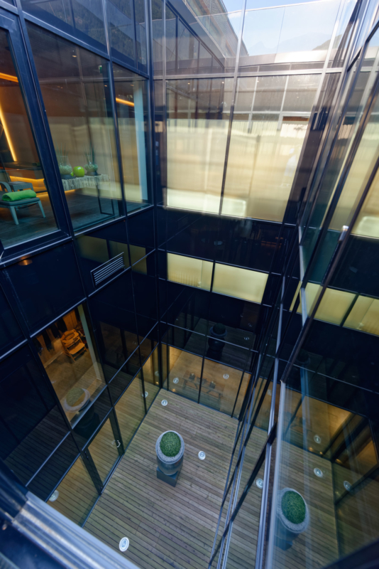 Zaradi tanke vidne širine, ki znaša samo 50 mm, je stilski dizajn viden tudi v notranjosti hotela: zaradi atrija hotel ne deluje obsežen in prosojen samo od zunaj. Tudi odprt pogled v notranje dvorišče nudi obiskovalcem dovolj dnevne svetlobe in omogoča zabrisan prehod med zunanjostjo in notranjostjo. Foto: heroal