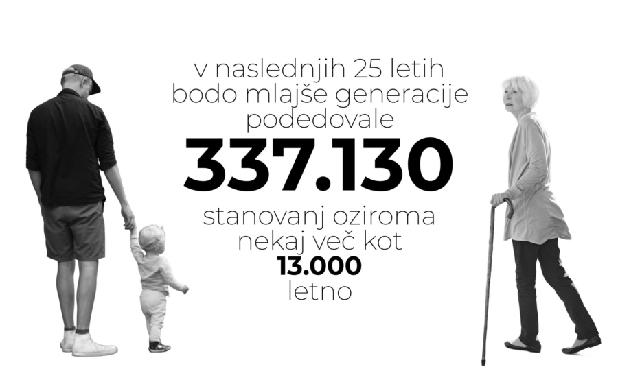 Če bi danes zgradili zadostno število stanovanj za mlade, bi naleteli na težavo nepremičnin, ki so v lasti starejših. Če upoštevamo naravo življenja, bodo starejši v naslednjih 25 letih postopoma zapustili ta svet in svoje imetje prepustili naslednikom. Tako bodo v obtok polagoma prešle vse nepremičnine starejših lastnikov (337.130). S tem je pričakovati, da bo mlajša generacija v naslednjih 25 letih podedovala približno 13.000 stanovanj na leto. Nekaj več nepremičnin (16.000)[4] se vsako leto proda. Naravni prirast prebivalstva ali nove migracije pa v Sloveniji za stanje potreb po novih stanovanjih niso bistveni.