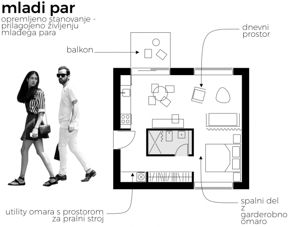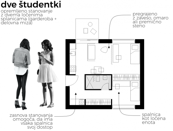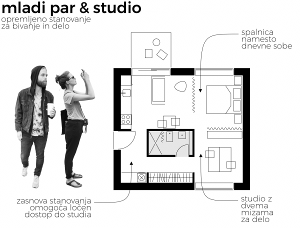 * S podanim primerom želiva na bolj ekspliciten način prikazati možnosti za drugačne stanovanjske rešitve, prilagojene dejanskim potrebam mlade generacije. To za seboj prinaša tudi drugačne koncepte pozidave, kot se trenutno prakiticirajo. Prav tu pa se odpirajo nove priložnosti in izzivi za arhitekte in investitorje. Prikazan primer ni dokončna arhitekturna rešitev.
