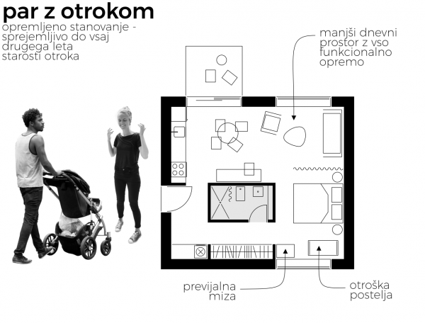 Kot rariteto je mogoče v nastajajoči soseski Zeleni gaj v Ljubljani najti manjše dvosobno stanovanje (47 m2), ki je po zasnovi precej klasično – pomanjšana različica klasičnega dvosobnega, ki v večini primerov meri ok. 7 m2 več. Čeprav je zasnova precej korektna, ne dopušča fleksibilnosti, ki je značilna potreba mladih (na primer možnost umestitve otroške postelje ali prilagoditve potrebam mladega podjetnika ali študenta). Življenjska dinamika je najbolj pestra prav med 20. in 35. letom življenja, zato ta ciljna skupina ljudi potrebuje funkcionalno čim bolj prilagodljiva stanovanja, ki lahko sledijo različnim trenutnim življenjskim potrebam. Samo s premikanjem notranje opreme znotraj zastavljenega gabarita bi moralo stanovanje omogočati enkrat bivanje s sostanovalcem v študentskem obdobju, drugič vzpostavitev delovnega prostora na začetku poklicne poti, tretjič primerno bivanje v dvoje, četrtič z otrokom. Takšne stanovanjske rešitve so praktične in humane, z močno socialno noto. Klasično zasnovano stanovanje, pa naj bo projektirano še tako skrbno in kakovostno, vendar brez omogočanja različnih načinov rabe, lahko kaj hitro postane velika ovira v spreminjajočih se bivalnih potrebah in pomeni kratkoročno rešitev.