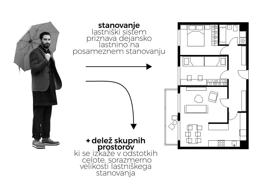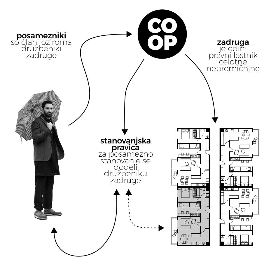 Stanovanjska kooperativa ni nekaj vesoljskega, je le drugačna pravna ureditev posesti stanovanjskih stavb. V lastniškem sistemu, ki je uveljavljen v Sloveniji in tudi sicer prevladuje v svetu, je prepoznana lastnina stanovanja v fizični obliki, pri čemer je jasno oz. znano, kateri zidovi komu pripadajo, na primer stanovanje 3B in pripadajoči delež skupnih prostorov, kar je zapisano tudi v zemljiški knjigi. Ob tem se poraja pomislek, ali je takšna pravna ureditev lastništva stanovanja ustrezna – še posebno če se primerja z lastništvom hiše, ki stoji na svoji parceli z upravljavskim odnosom lastnika, in s stanovanjskim blokom, kjer je prisoten dokaj kompleksen lastniško-upravljavski odnos. V kooperativni ureditvi ni lastništva dotične stvari v naravi, temveč se pripadajoči delež vodi v obliki kooperativnega družbeništva s pridobljeno stanovanjsko pravico, na primer za stanovanje 3B. V naravi to pomeni lastništvo deleža celotne družbe v sorazmerju z velikostjo stanovanja, za katero je bila pridobljena stanovanjska pravica.