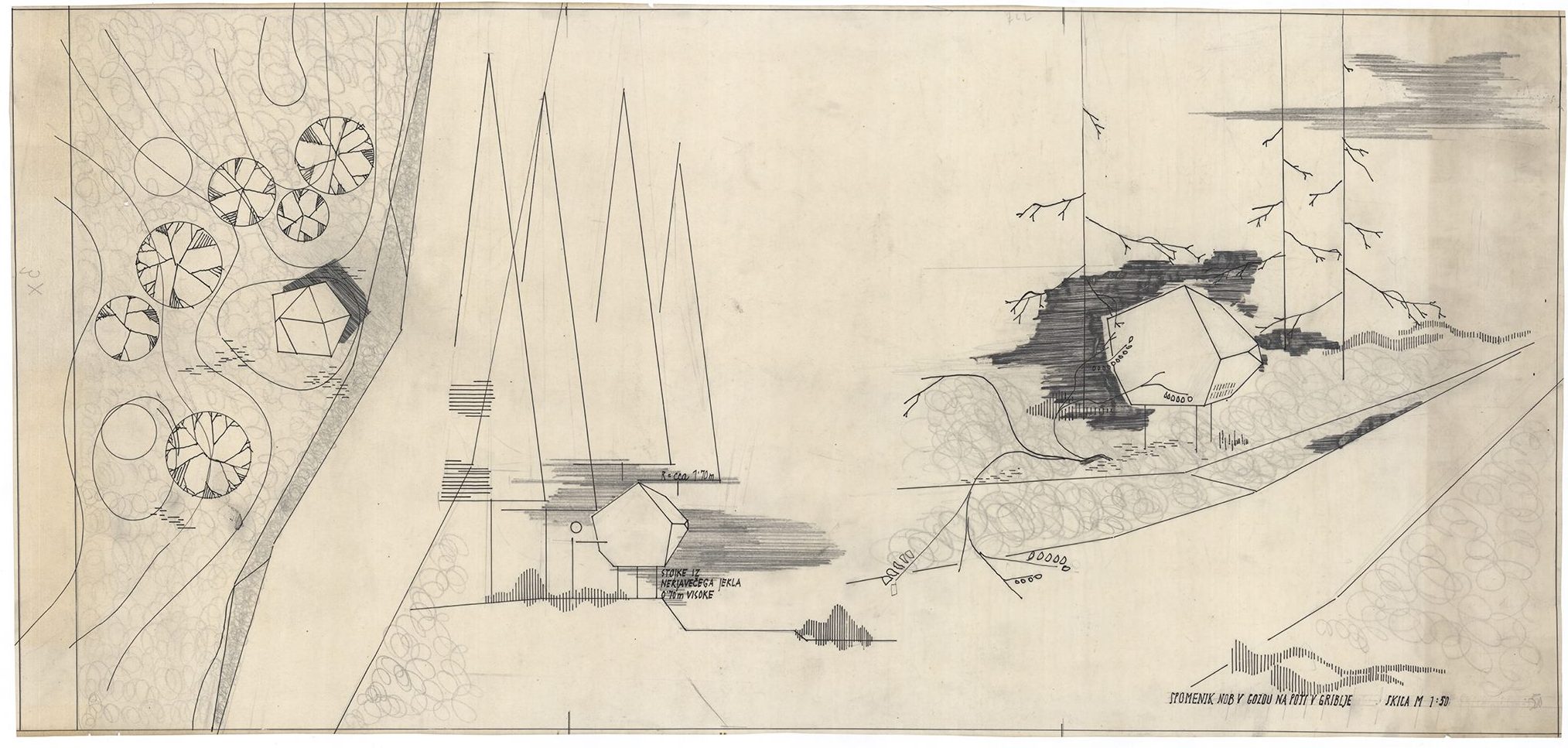 Risba za spomenik NOB v Gribljah (Bela Krajina) v soavtorstvu s kiparjem Jakobom Savinškom, 1960 (vir: MAO)