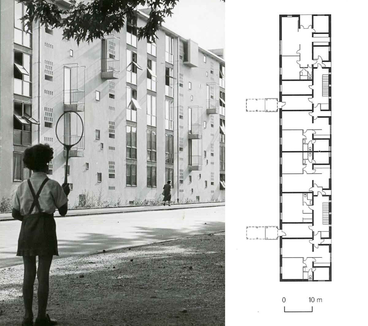 Prijateljeva ulica, Ljubljana (1957), in Tabor, Ljubljana Vzdolžna zasnova v 10 metrov široki lameli, ki omogoča odpiranje posameznih stanovanj z racionalnimi krožnimi tlorisi na dve strani neba hkrati.