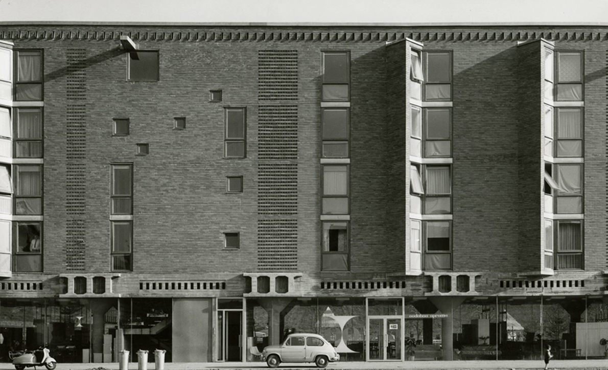 Podobno idejo je uporabil v trgovsko-stanovanjskem bloku v Velenju (1963), a ponavljati se nikoli ni želel, zato je tu zasnova sveža in enako drzna: v osnovi je uporabil eno temeljnih Le Corbusierevih načel svobodnega pritličja, ki je odprto in v celoti zastekljeno, v notranjost pa so pomaknjeni močni betonski slopi, ki nad pritličjem nosijo nosilno ploščo, na fasadi izraženo v ritmu prečnih nosilcev. A nad trgovskim pritličjem se zgodba povsem obrne tako vsebinsko, konstrukcijsko kot izrazno: stanovanjska nadstropja so zidana klasično, z nosilno fasado in vzdolžnimi zidovi po sredini stavbe. Tudi tu pa je v celoti jasno konceptualno in konstrukcijsko idejo nadgradil s poetično igro detajlov, zaradi katere je zgradba ena ikon slovenskega modernizma. Zanjo je prejel tudi svoje prvo večje priznanje, nagrado Prešernovega sklada.