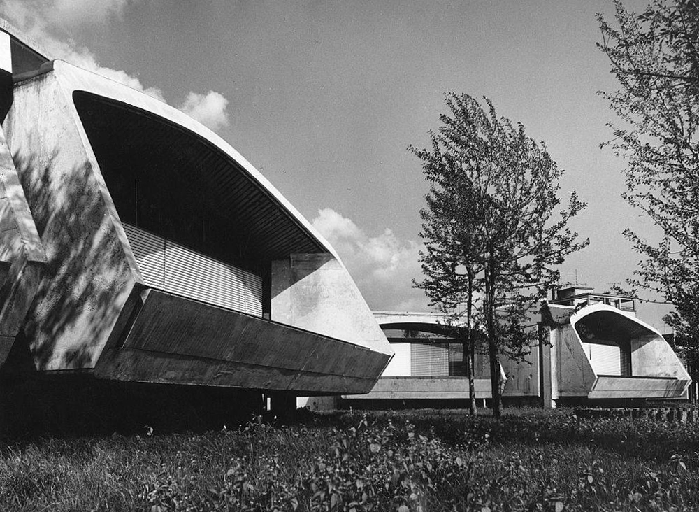 Strukturalistična zasnova z betonskimi lupinami igralnic, ki so povezane s servisnim in komunikacijskim jedrom.