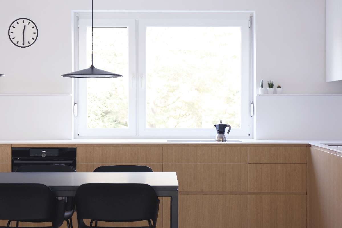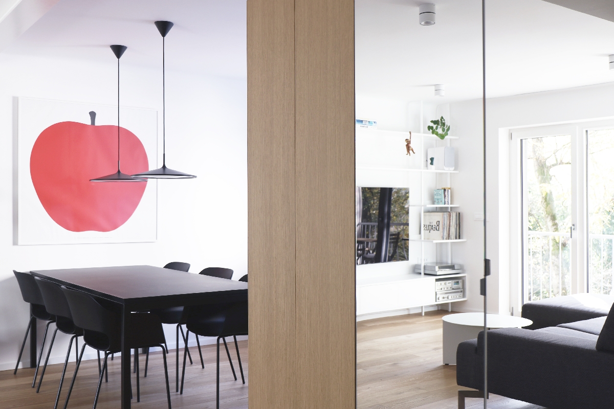 Ena glavnih prednosti stanovanja je obojestranska osvetljenost bivalnega prostora. Zaradi obilice naravne svetlobe so tam lahko uvedli več temnejših tonov materiala. V kuhinji tako prevladuje hrastov furnir, poudarek prostora pa je črna jedilna miza.