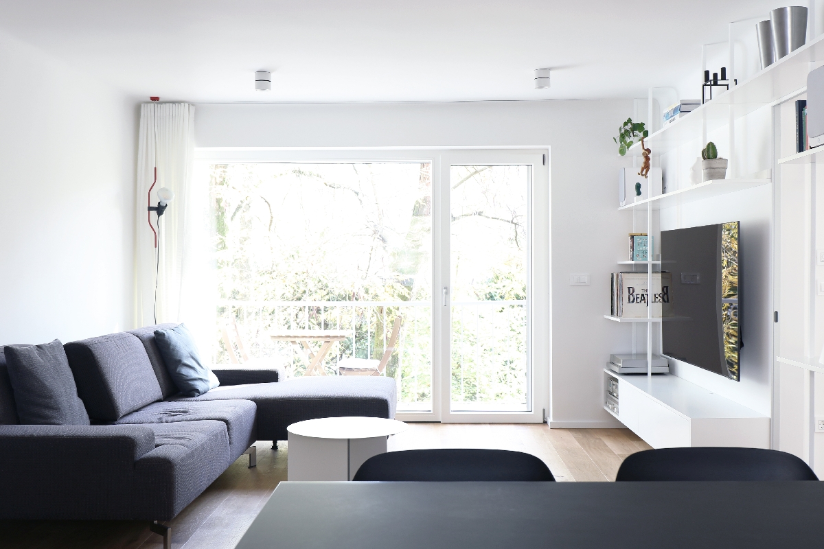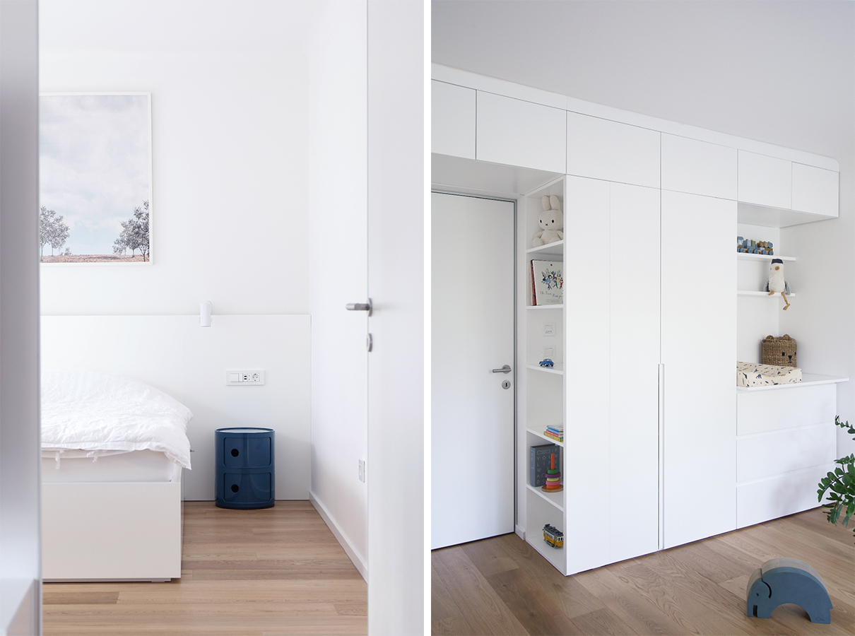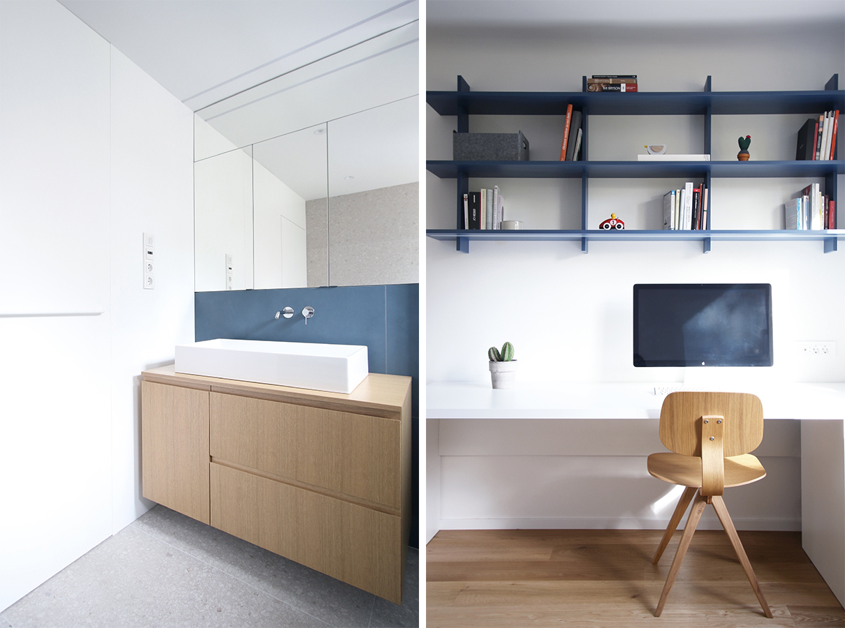 Naročnik je za spalnico in otroško sobo želel čim bolj svetlo pohištvo; prevladujočo belino sta arhitekta dopolnila z modrimi dodatki. Izbira se ponovi v odtenku stenskih ploščic v kopalnici, ki jo talna keramika z učinkom teraca poveže z vežo.