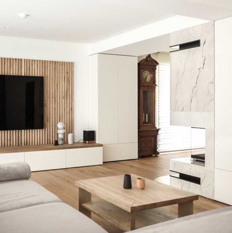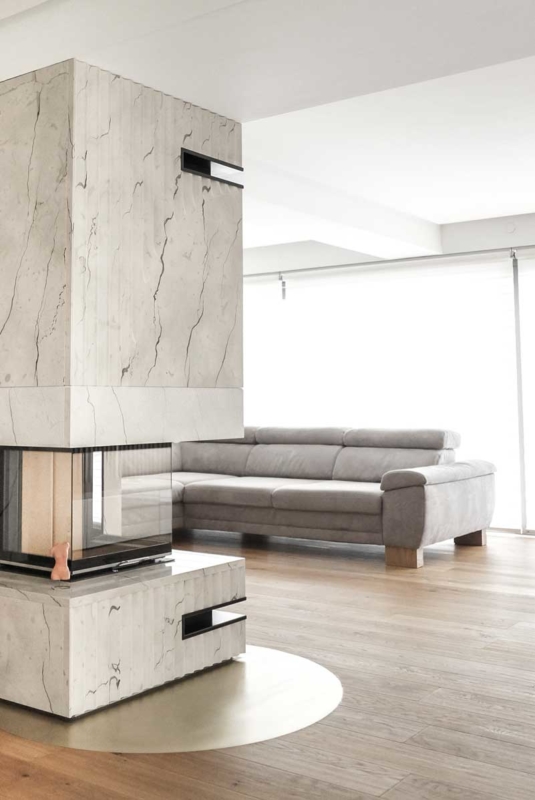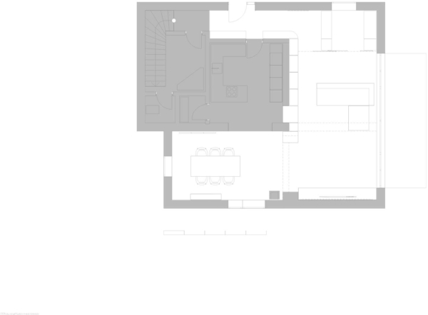Nekdanja kmečka hiša je bila že večkrat prenovljena in predelana: nazadnje je prenova potekala pred 15 leti. Vsak izmed posegov je v prostor kaj novega vnesel, iz njega pa tudi kaj odstranil. Ko so se s prostorom srečali arhitekti iz Studia AINO, od prvotne hiše tako ni več veliko ostalo. Edini izvorni element je bila krušna peč, ki pa je bila daleč prevelika, da bi jo bilo smiselno obdržati. Arhitekti so se preteklosti zato poklonili na izviren način, ki je spoštljiv tako do znanja preteklosti kot do sodobnega načina bivanja. Ohranili so debelo nosilno steno, na kateri je bila nekoč peč, jo še dodatno poudarili in vzeli za glavni motiv novega stanovanja.