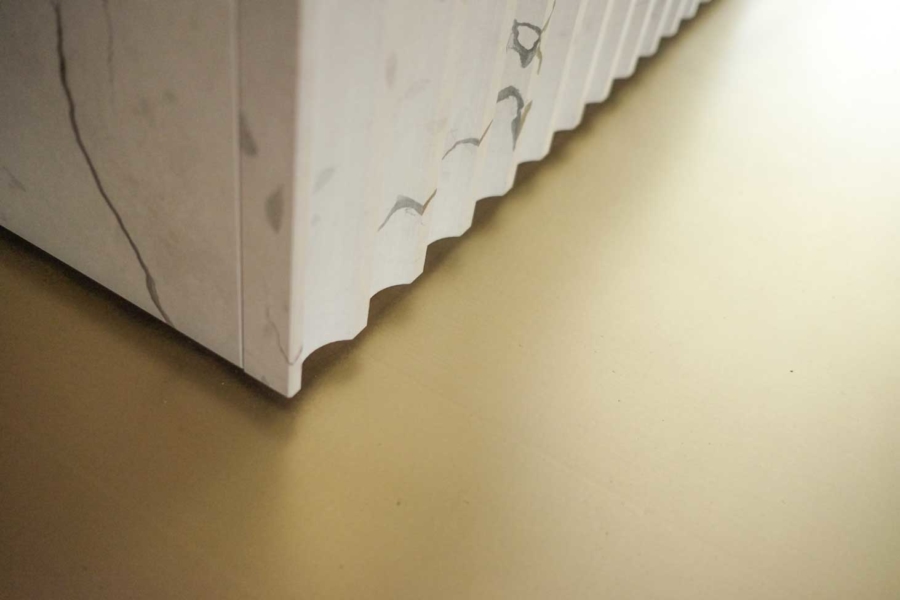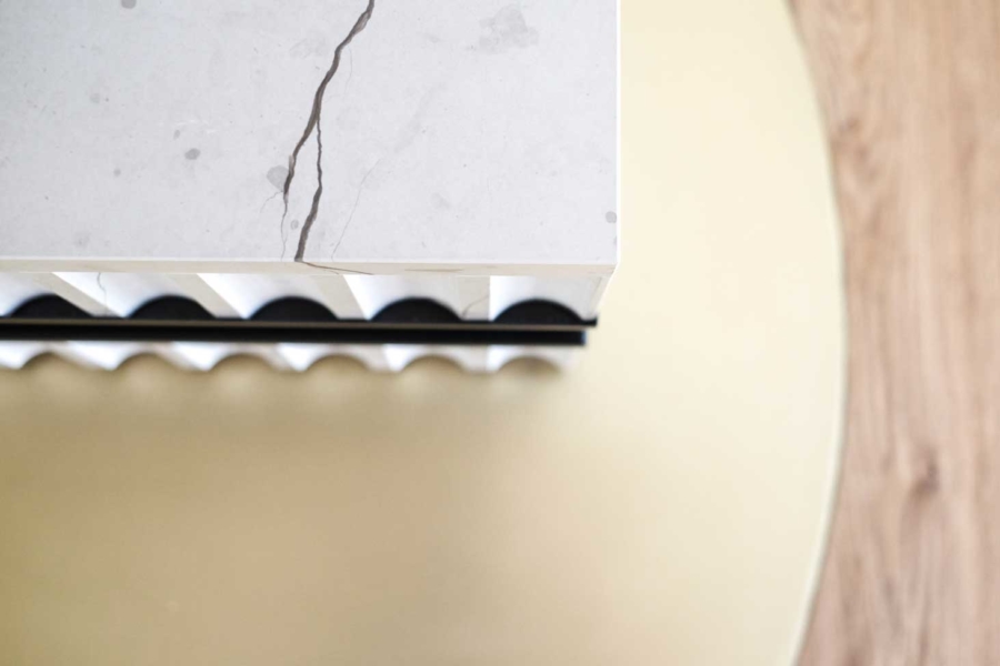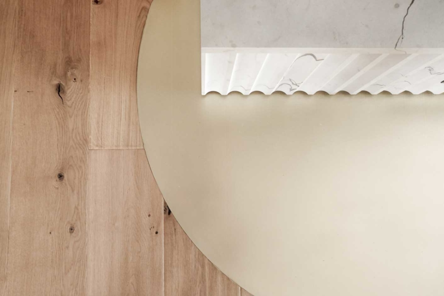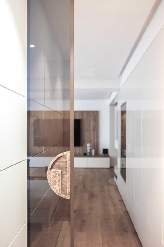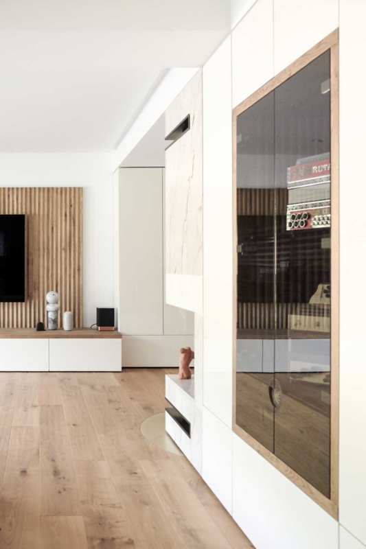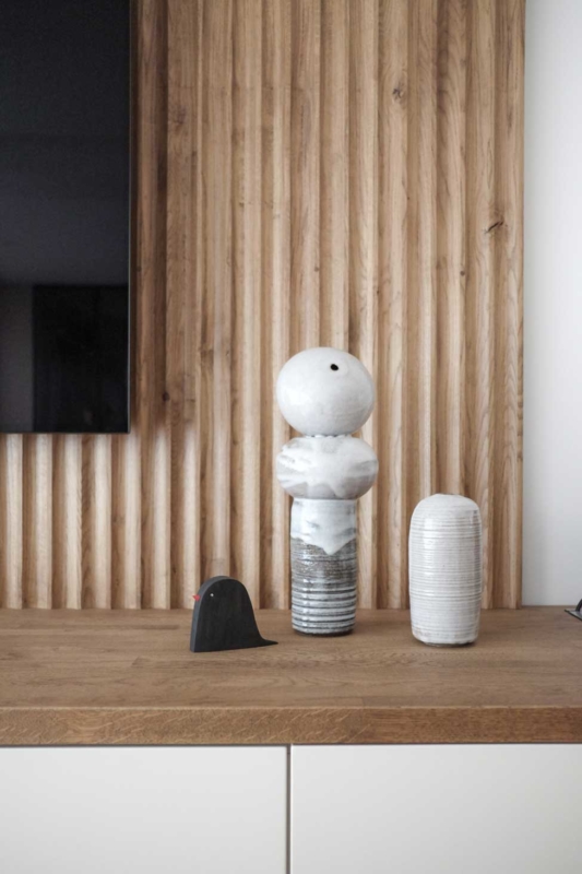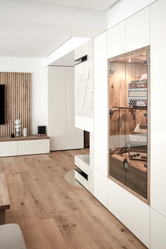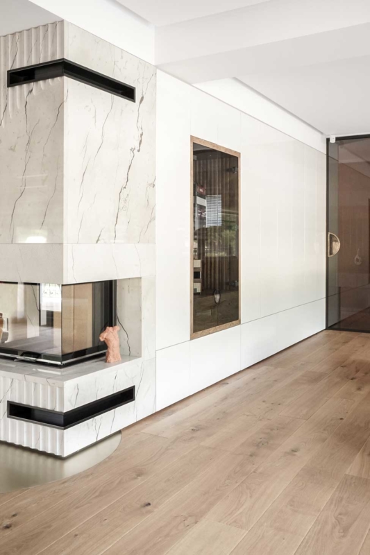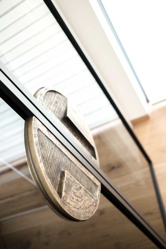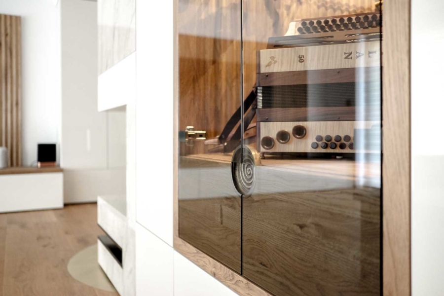 Na mestu peči je bila vgrajena nova vitrina, skozi katero je iz dnevne sobe moč videti v kuhinjo in obratno. Intervencija tako vizualno povečuje prostor, ne da bi popolnoma odstranila staro steno. Studio AINO se v svojih projektih detajlom posveča z izjemno natančnostjo, in Hiša spomina ni nič drugačna: vrata vitrine ter ena izmed notranjih vrat krasita unikatni kljuki iz medenine, ki so ju zasnovali v studiu. Vsak projekt prinaša spoznavanje novih materialov in čudovite možnosti, ki jih ponujajo, pravijo arhitekti. Prav ta ljubezen do materialov je botrovala tudi izvedbi drobnih, a nadvse izpovednih detajlov v Hiši spomina, ki kakovostno arhitekturo nadgrajujejo v čisti presežek.