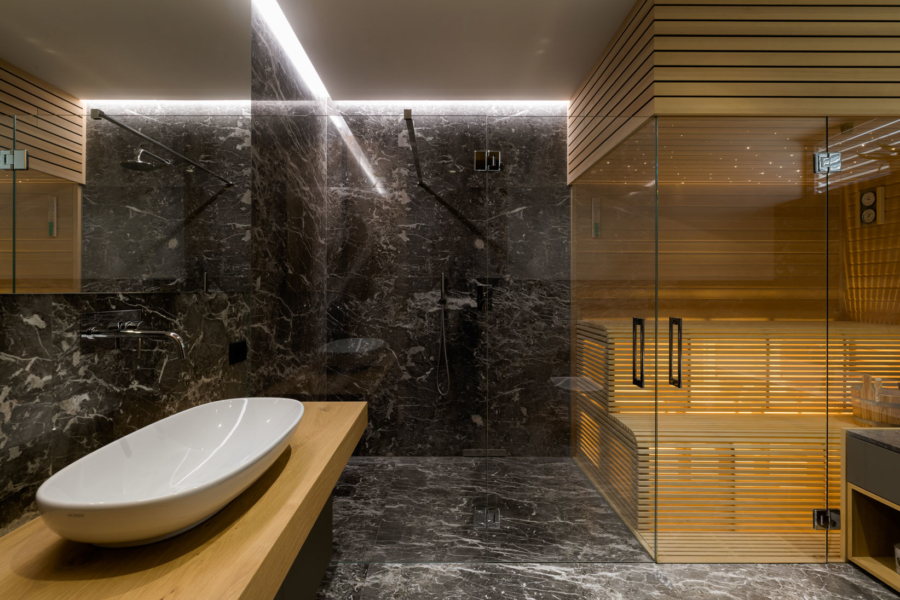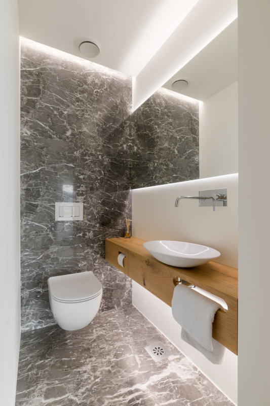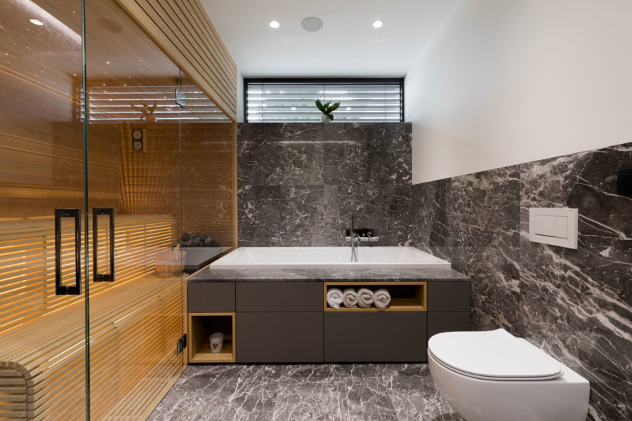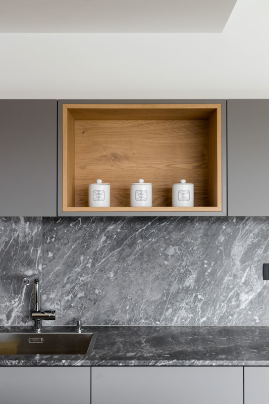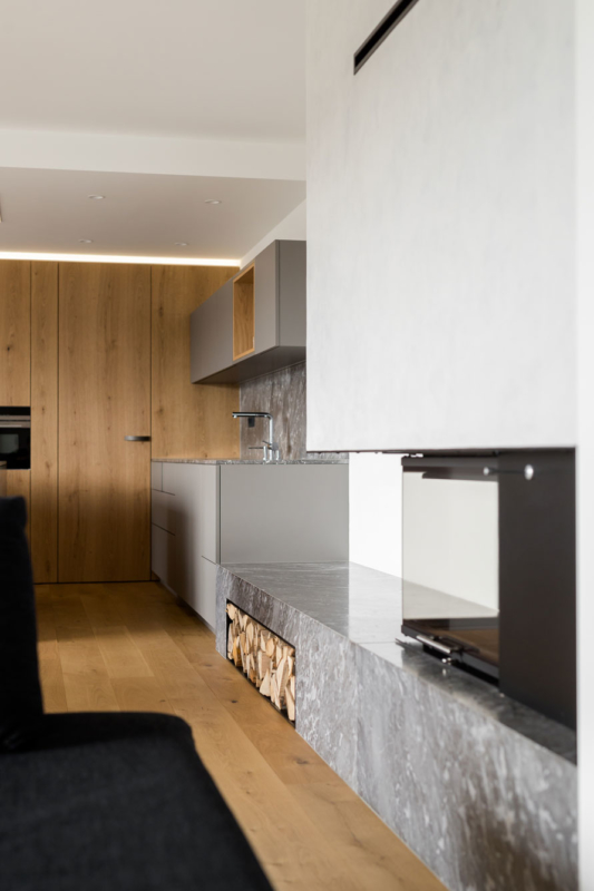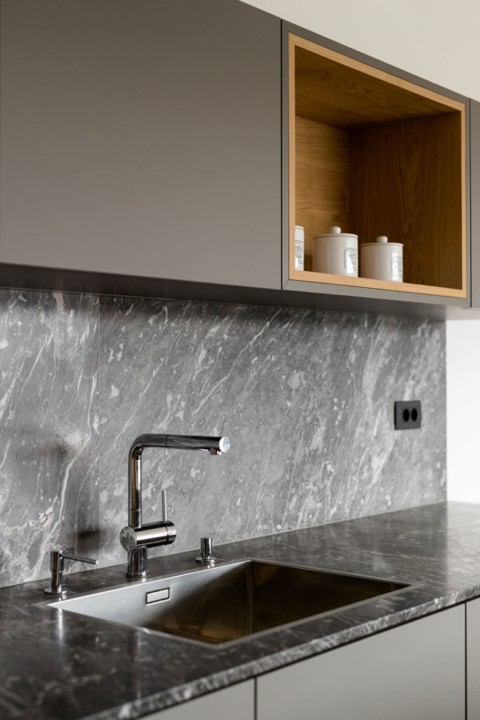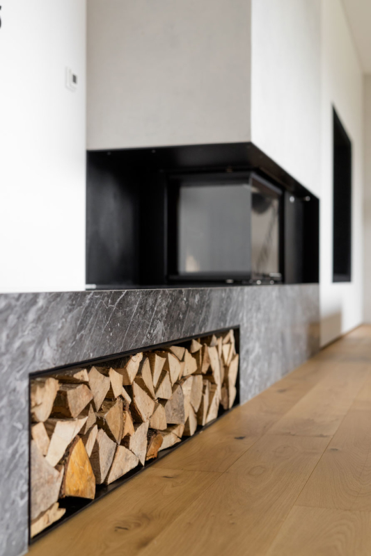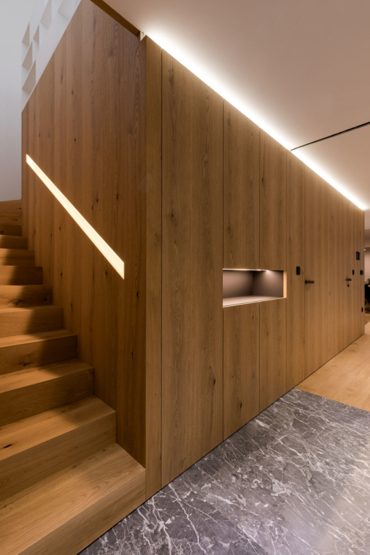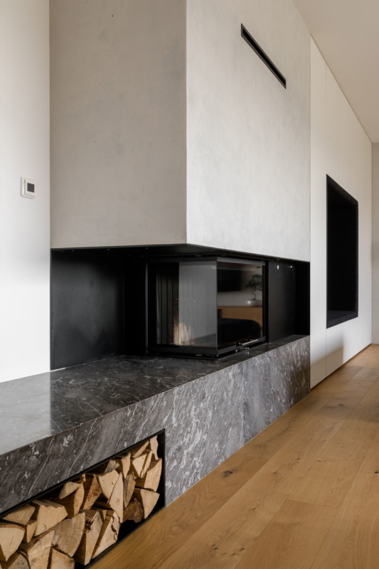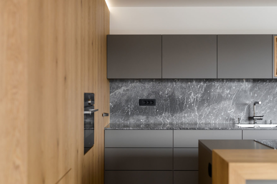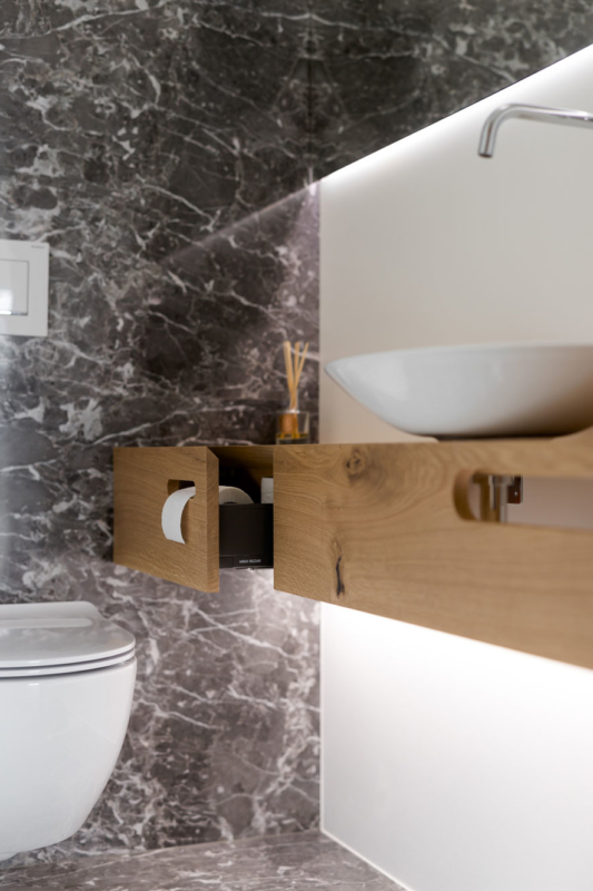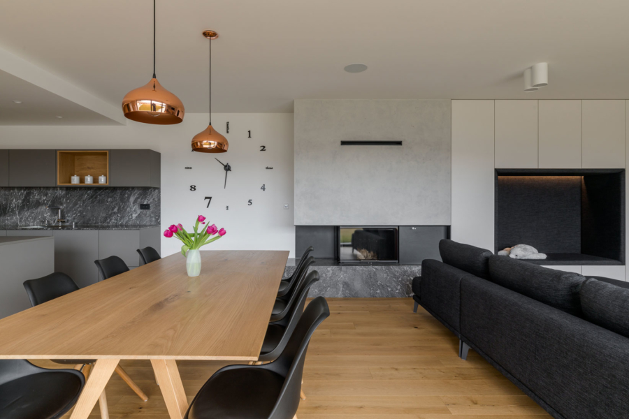 Gre za nekoliko drugačno sodelovanje med arhitekti in izvajalci – slednji so bili tokrat namreč tudi v vlogi naročnikov. Mizar je na enem prejšnjih projektov, na katerem je sodeloval z arhitekti, vzljubil hotaveljski marmor, zato je bila ena prvih želja ob opremi nove hiše tudi uporaba tega dragocenega kamna. Arhitekta sta ga uporabila na več mestih v interierju, vendar na prefinjen način, da ta ne bi deloval težko in preveč nasičeno. S kamnom se izmenjuje les, ki je prav tako eden glavnih materialov, uporabljenih pri oblikovanju notranje opreme. Seveda je, kot se spodobi, lesene dele izvedel kar mizar sam. Tretji povezovalni element pa je siva barva, ki se pojavlja na pohištvu in dodatkih skozi vso hišo.