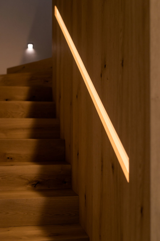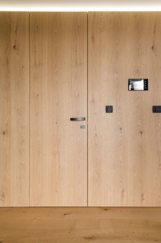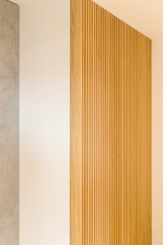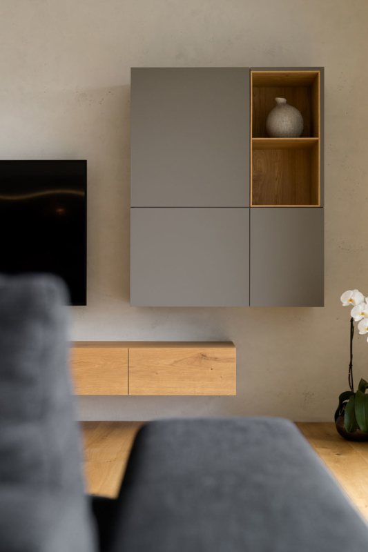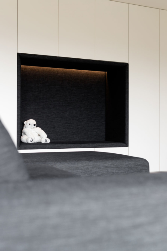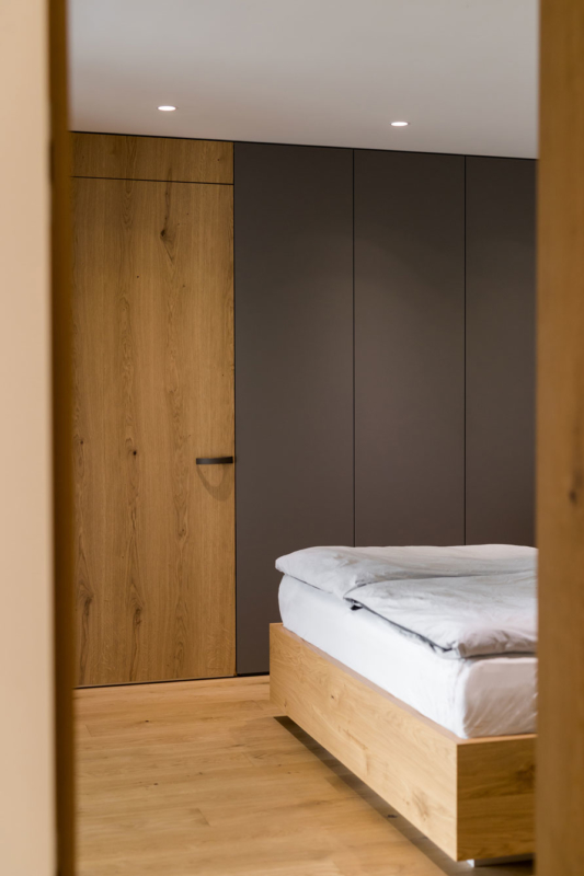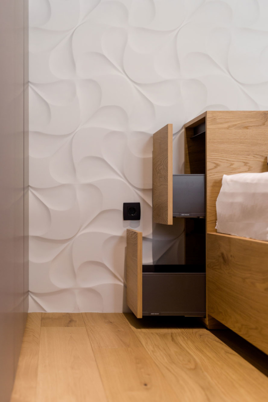 V dnevni sobi je veliko prostora za shranjevanje, niša, ki prekine omaro pa je strateško pozicionirana tako, da uokviri pogled skozi okno. Prostora po drugi strani primanjkuje v spalnici, zato je tam namesto nočnih omaric za posteljo kar omara, ki poveča volumen prostora za shranjevanje. Domišljene ideje arhitektov, ki jih je kakovostno izvedla spretna mizarjeva roka, so skupaj nepremagljiv tandem. Hiša je polna zanimivih stikov in detajlov, ki bodo novim stanovalcem še leta lepšali dneve. Ljubezen do naravnih materialov, ki je združila arhitekte in naročnike, pa je tisto, kar ta interier dela brezčasen in domač hkrati.
