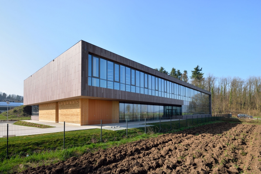 Arhitektura stavbe sledi krajinskim prvinam, to je členitvi prostora z izrazito horizontalno kot vertikalno dominanto. Fasade stavbe so velika transparentna opna uokvirjena v čvrst paspartu, ki uokvirja stavbno maso. Fasadne površine členijo enovita transparentna polja in fasadna polnila, ki preko robov prehajajo v bočne fasadne ravnine ter tvorijo stavbne mase.