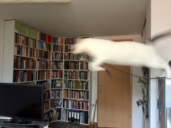 Pokličem Cherryja, ker ga nisem videla že dve uri in mi je dolgčas brez njega. Priteče izpod postelje in me nepremično gleda, samo rep šviga sem in tja. Potem skoči na prvi tram med okni in še na drugega. Rado se mu tako zmeša. Zato med tramove nočem postavila knjižnih polic, ker bi posegala v mačkov prostor.
