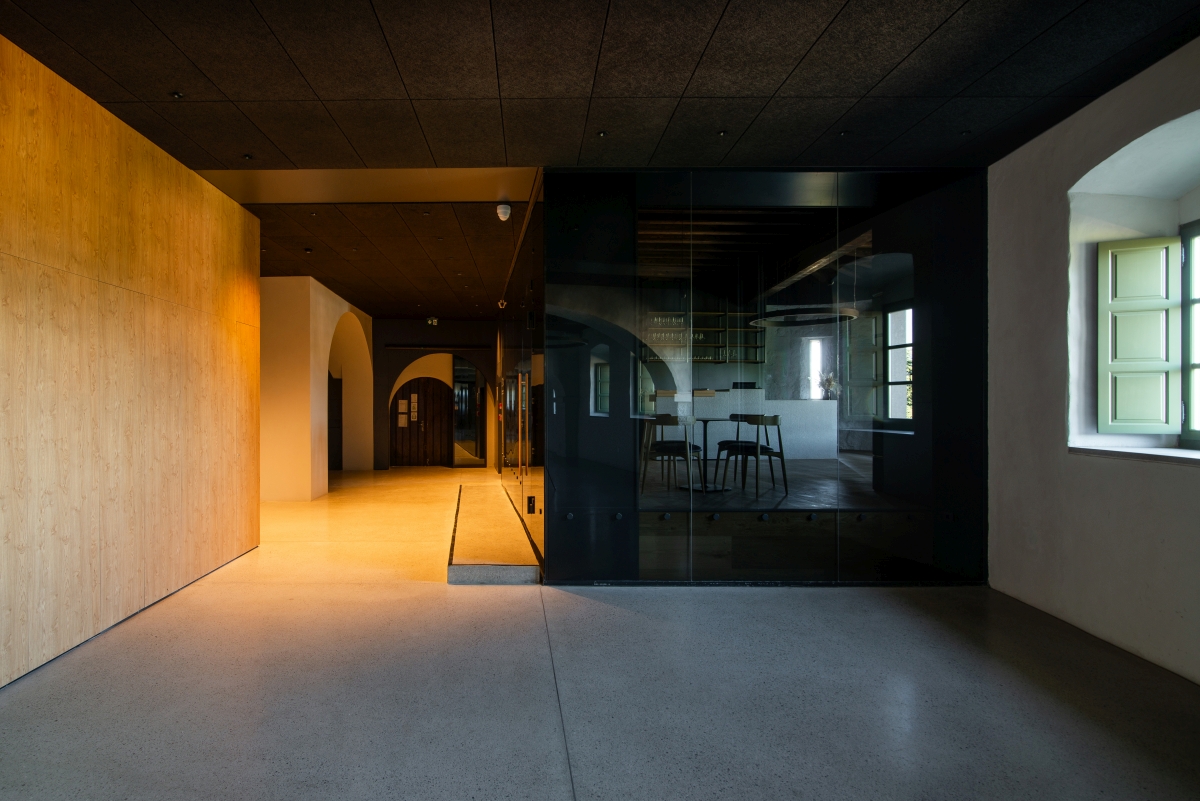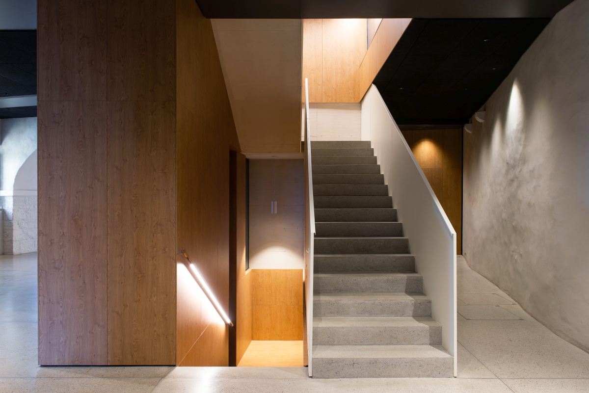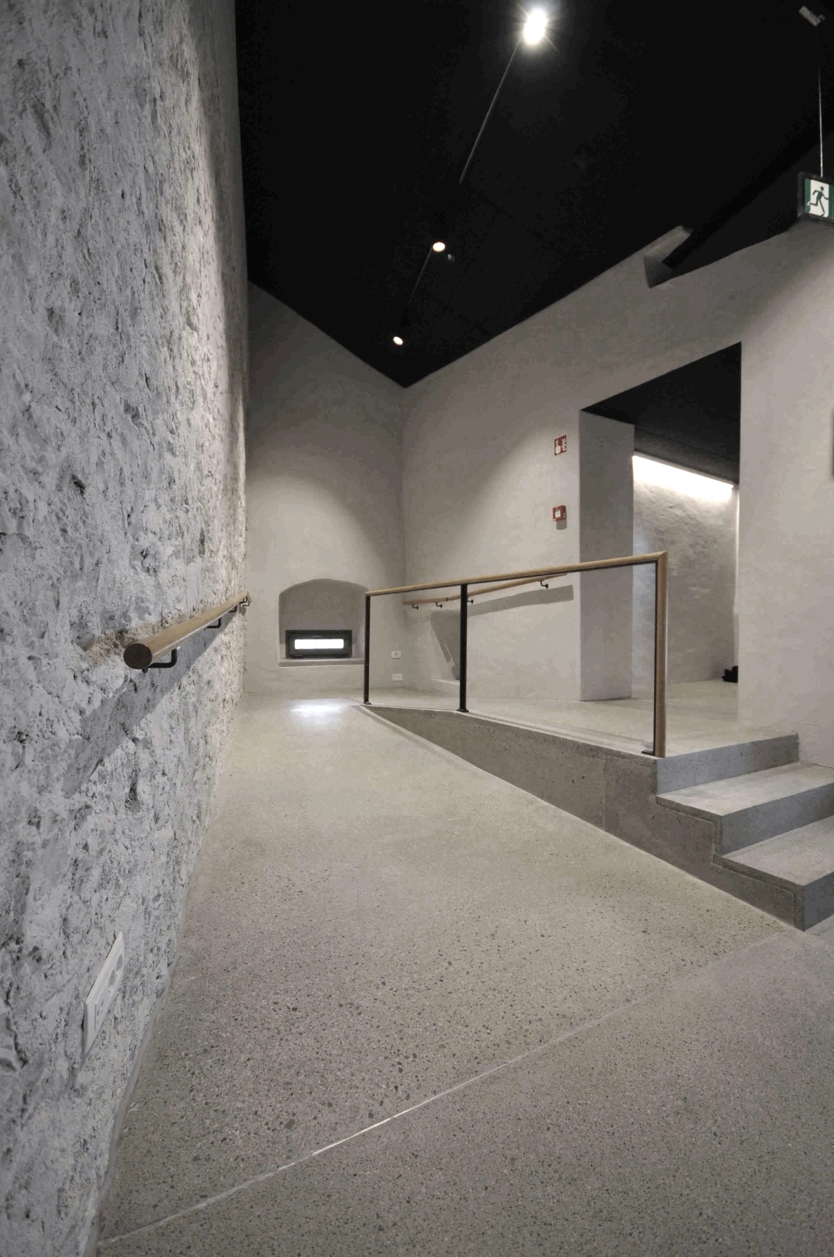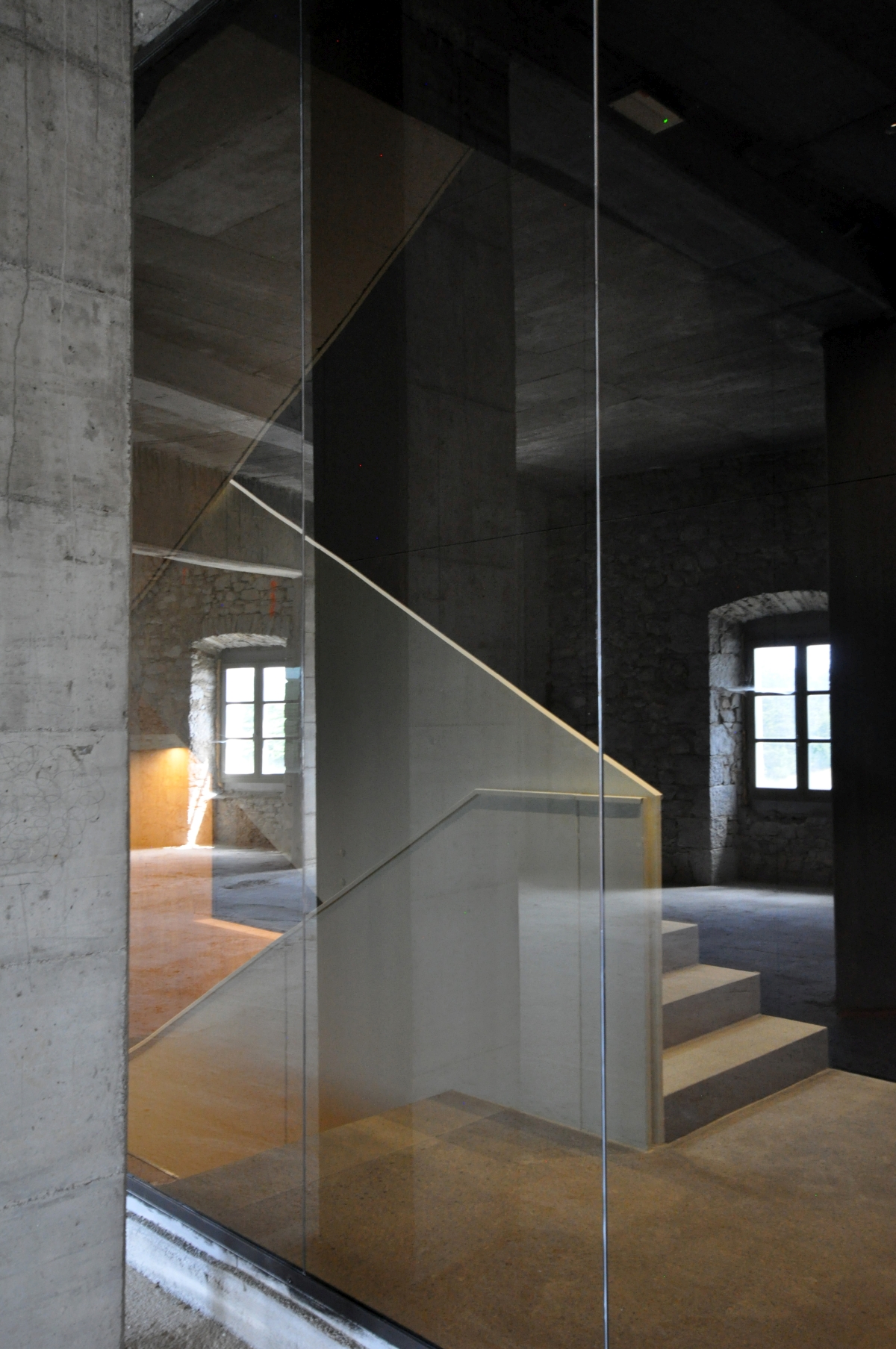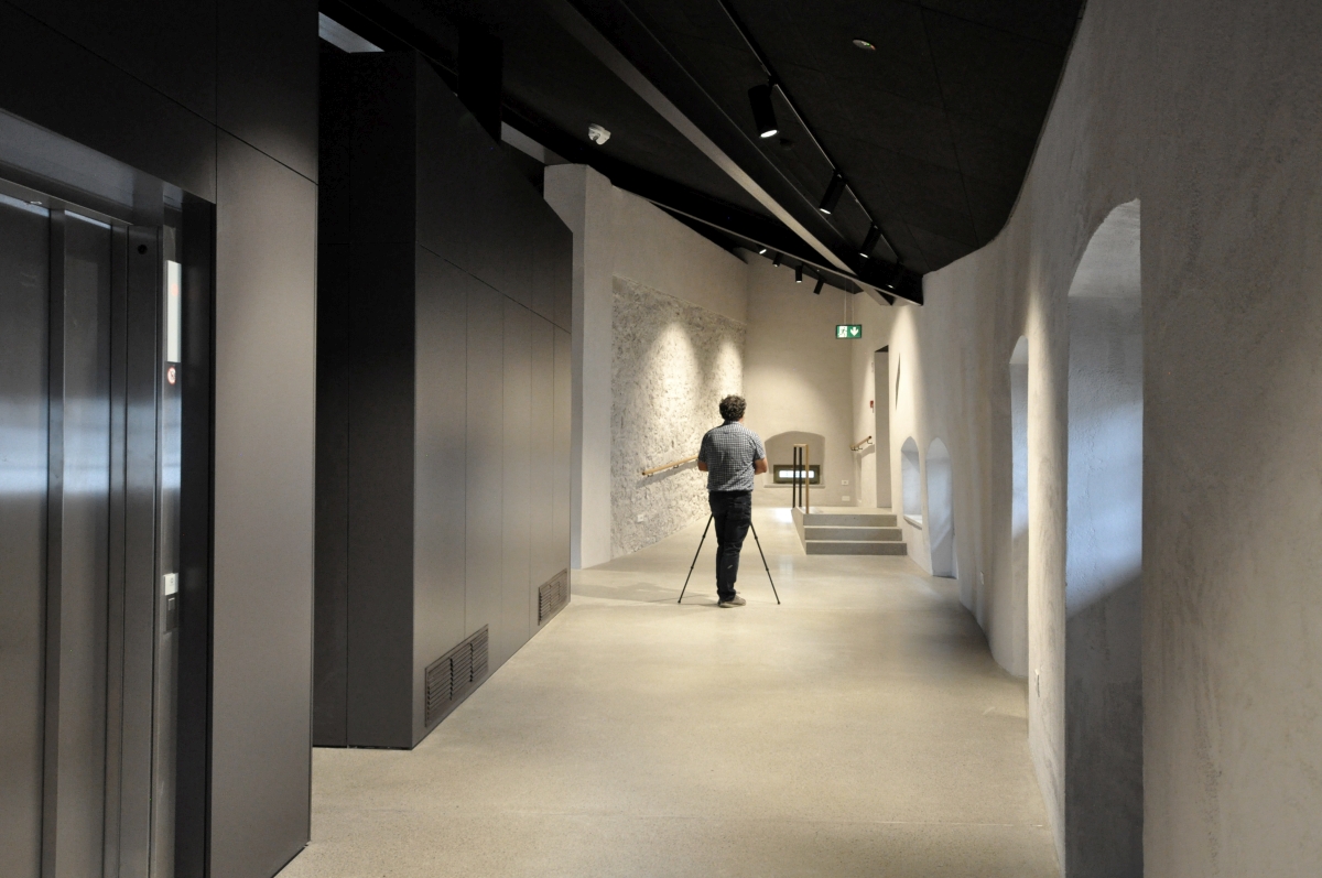 Obstoječi kamniti zidovi, ki imajo kvalitetno strukturo ali vsebujejo detajle, ki jih je bilo vredno prezentirati, so zgolj prebarvani z apneno barvo, da je struktura kamna lepo vidna. Na enak način so obdelani novi armiranobetonski nosilni elementi v kleti in glavnem stopnišču. S tem sta prikazani sta obe tehnologiji gradnje, stara in nova. Tako kamen nekoč kot beton danes odražata karakter svoje dobe.