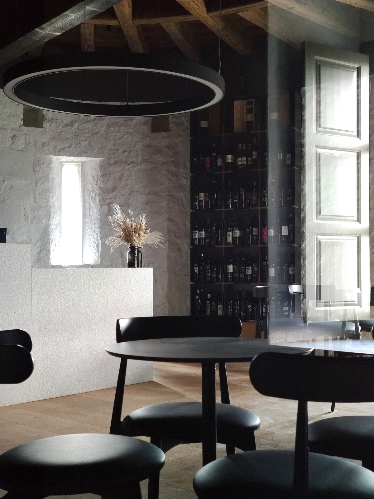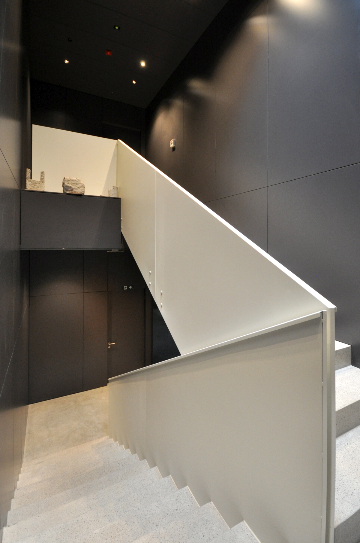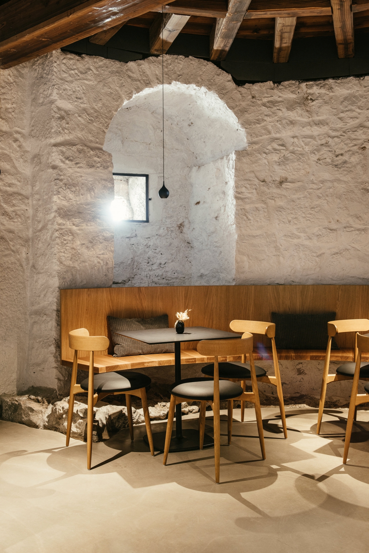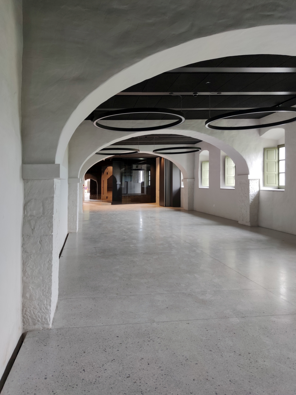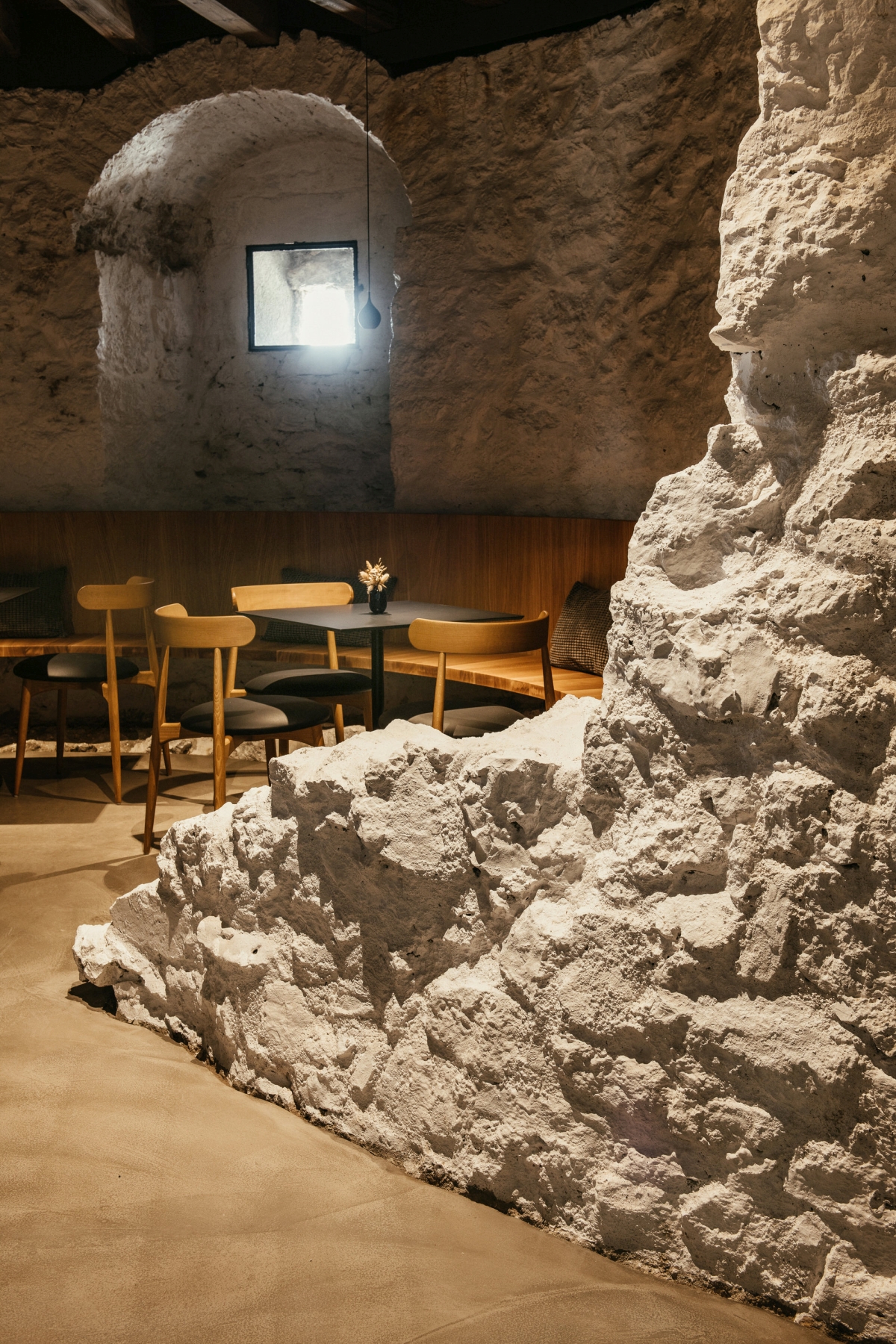 Obstoječi kamniti zidovi, ki imajo kvalitetno strukturo ali vsebujejo detajle, ki jih je bilo vredno prezentirati, so zgolj prebarvani z apneno barvo, da je struktura kamna lepo vidna. Na enak način so obdelani novi armiranobetonski nosilni elementi v kleti in glavnem stopnišču. S tem sta prikazani sta obe tehnologiji gradnje, stara in nova. Tako kamen nekoč kot beton danes odražata karakter svoje dobe.