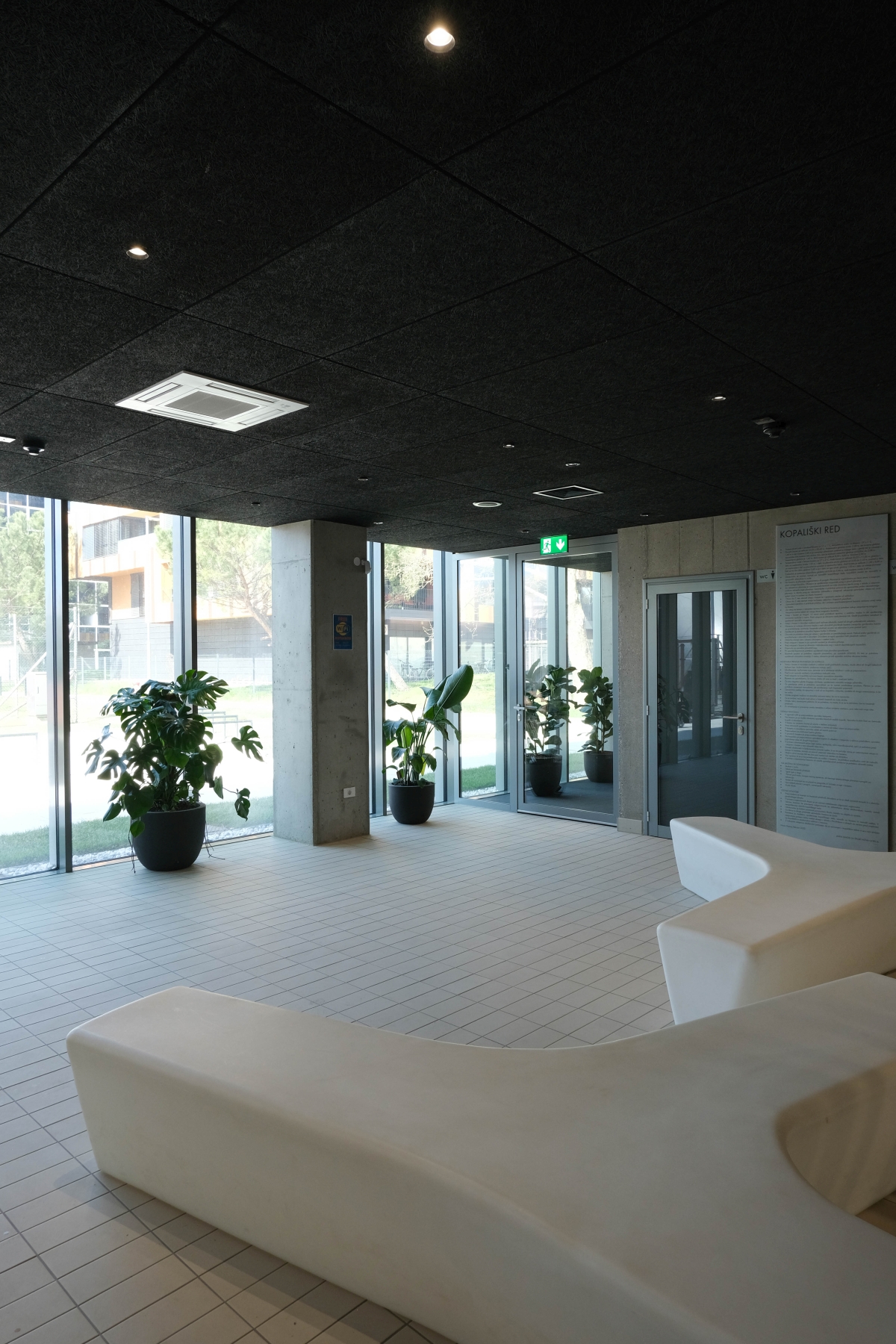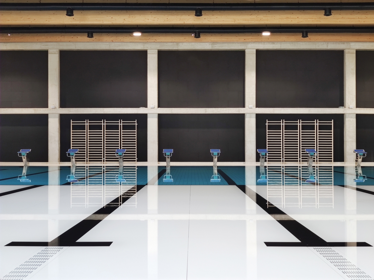 Črni akustični stropovi in svetla enobarvna tla dodatno poudarjajo kompozicijo glavnih konstrukcijskih elementov. Betonski stebri in leseni lepljeni nosilci skupaj s strukturno fasado preko enotnega bazenskega prostora tvorijo jasen in enakomeren raster, ki se zrcali v vodni gladini, kar – kot izpostavi arhitektka Teja Savelli – dodatno poudarja simetrijo, uravnoteženost in pravilnost arhitekturne kompozicije.