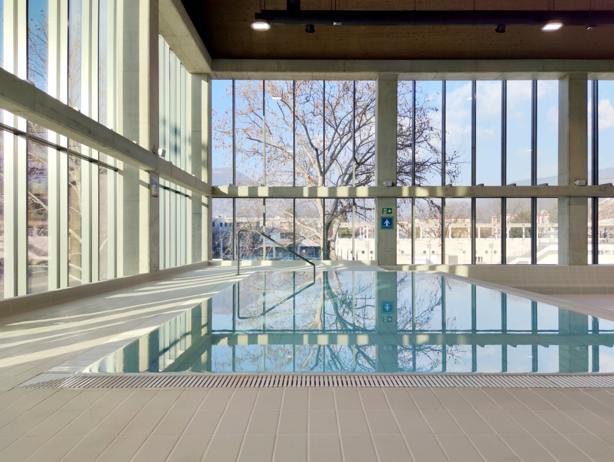 Bazenska ploščad je dvignjena na raven prvega nadstropja, kjer se razprostira po celotni površini, velike fasadne zasteklitve na tri strani pa zagotavljajo dobro naravno osvetlitev globoko v notranjost prostora in kopališče povezujejo s pogledom na zunanji bazen in igrišče ter okoliške hribe, ki objemajo mesto s severa.
