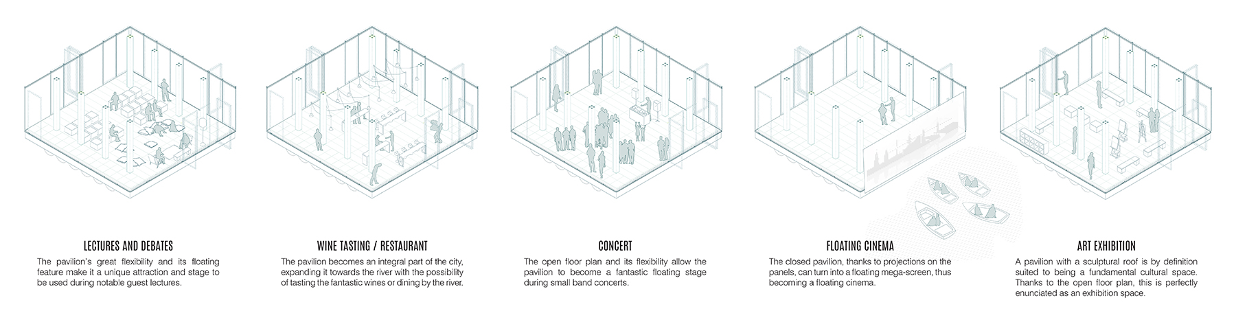 Zahvaljujoč svoji preprosti konstrukciji iz 8 stebrov, ki jih tvorijo 4 pokončni elementi kvadratnega preseka, ki povezujejo splav in pokrov, je paviljon gibljiv in prilagodljiv za različne priložnosti, kot so razprave z gosti, degustacije vin, umetniške razstave, kot majhna plavajoča restavracija, ki se lahko uporablja v času Festivala Lent, pa tudi kot plavajoči kino, ki uporablja površino obodnih okvirjev paviljona kot projekcijsko platno.