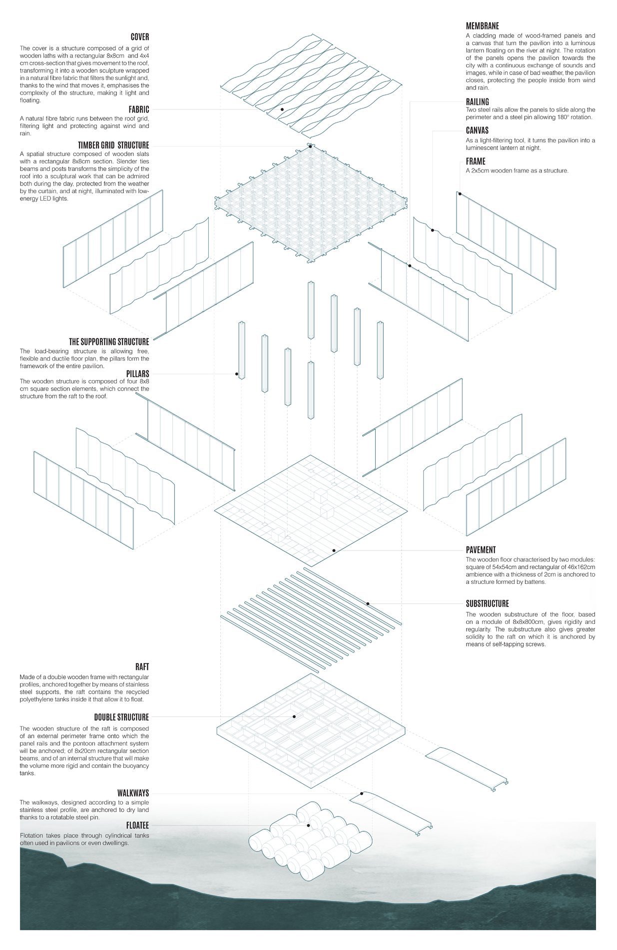 Les – lokalen, duktilen in fleksibilen material – se uporablja v različnih oblikah in velikostih, predvsem v strešni predalčni konstrukciji, kar poudarja pomen načel trajnosti in tehnološke inovativnosti. Splav, sestavljen iz vzgonskih tankov, je prekrit z lesenim okvirjem, na katerega je nameščeno vodilo iz pocinkane pločevine za premikanje in rotacijo panelov nad nivojem vode. Paviljon tako postane dematerializiran element, za katerega se zdi, kot da bi lebdel na rečni gladini.