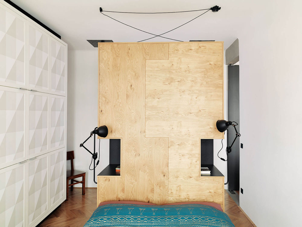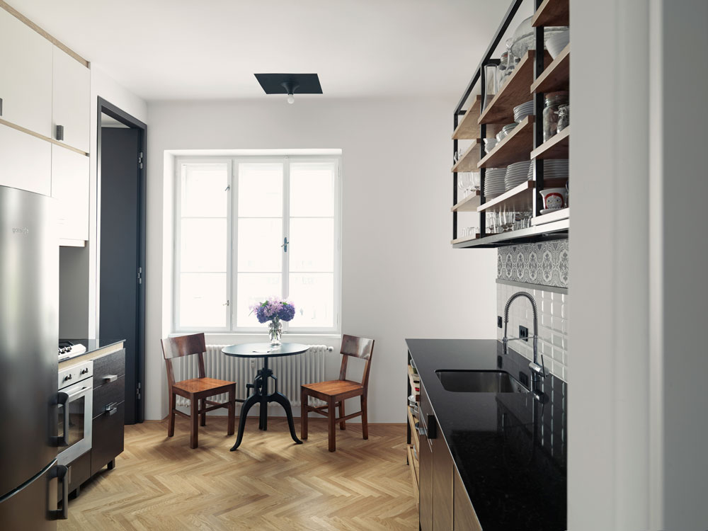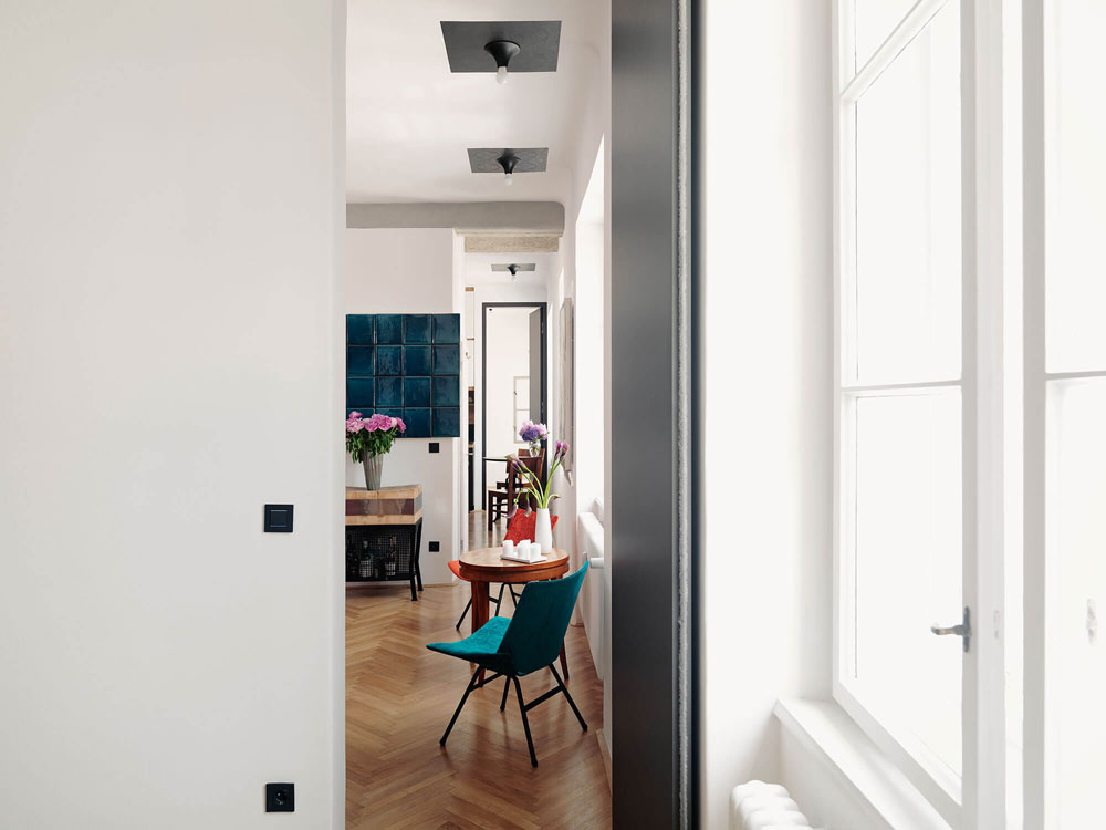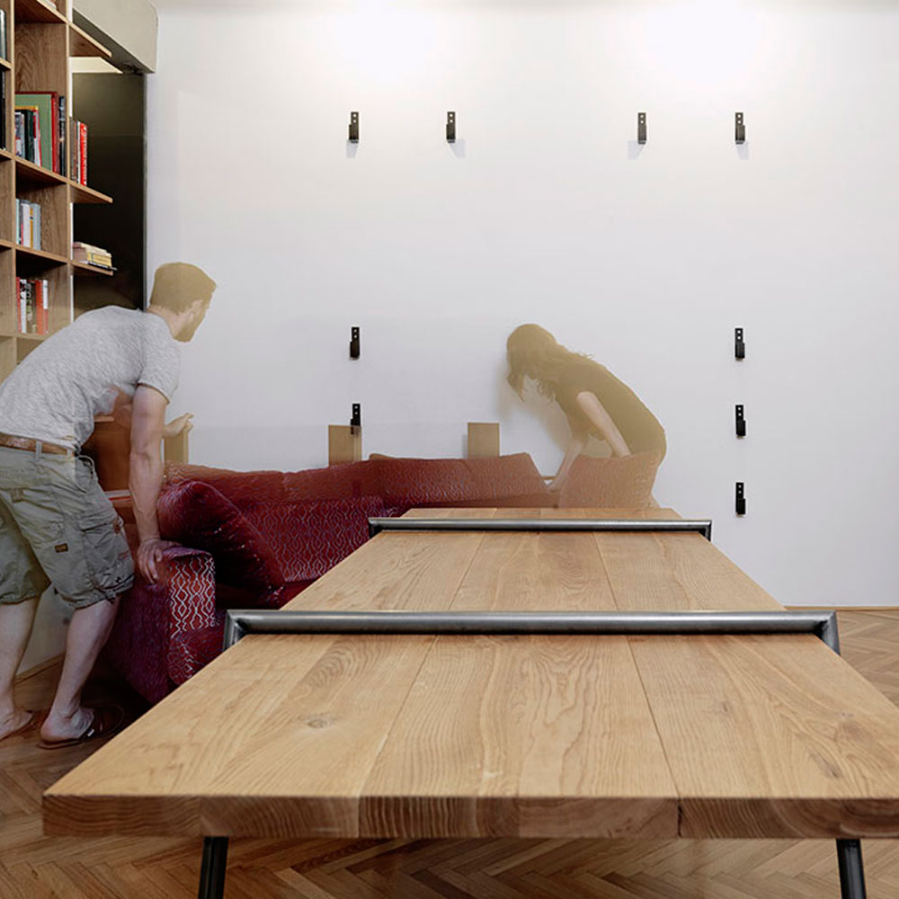 Zanimivi so oblikovalski detajli po meri narejenega pohištva. Mlad par lahko goste posedi za veliko mizo, ki jo po koncu zabave razstavita in obesita na steno. Mizo Quadra sta stanovalca – z dovoljenjem oblikovalca – naredila po načrtih Luisa Arrivilaga: iz dveh zvarjenih kovinskih podpor med kateri umestita lesene plohe. Arhitekti so belino stanovanja popestrili z detajli odkritega opečnatega zidu v spalnici, poslikano keramiko v kuhinji, nemaskiranimi betonskimi prekladami in policami iz masivnega lesa. Z lastnikoma so umestili pretapecirane kultne Lupine in počivalnike oblikovalca Nika Kralja, predelali staro mesarsko klado iz katere je nastal bar in stenske luči, ki se jih lahko premika po potrebi. Modra stenska umetnina je avtorsko delo arhitekta Andreja Mercine. Uporabil je pečnice s peči v spalnici, ki so jo zaradi neuporabe podrli. Po celem stanovanju so skrbno umeščeni tudi starinski kosi pohištva z željo, da bi kljub modernemu videzu ohranili povezavo s časom, v katerem je stanovanje nastalo.