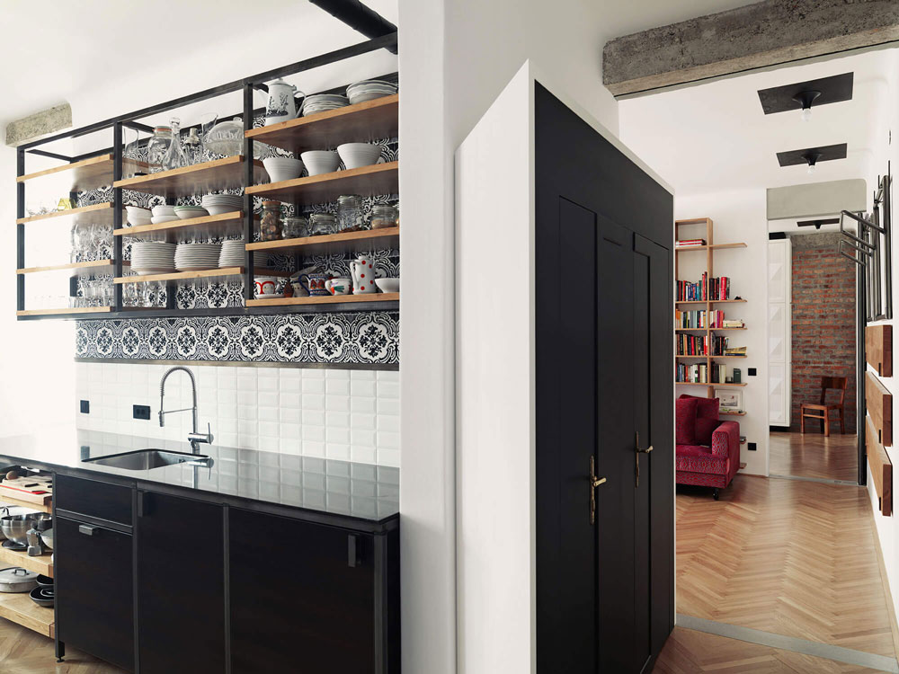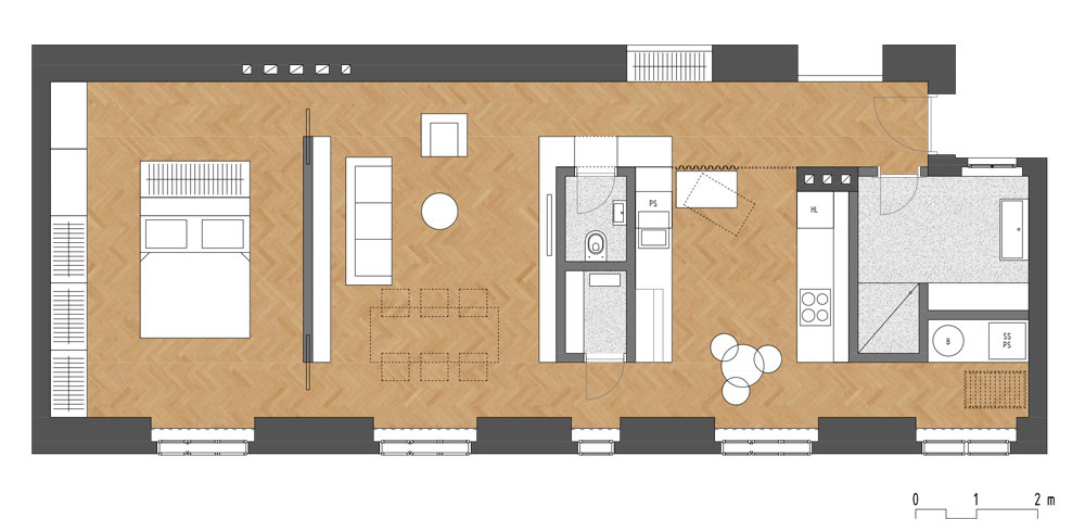 Zanimiva je krožna pot skozi stanovanje, pri kateri so posamezne enote hkrati samostojni otoki in povezani del bivalne celote.