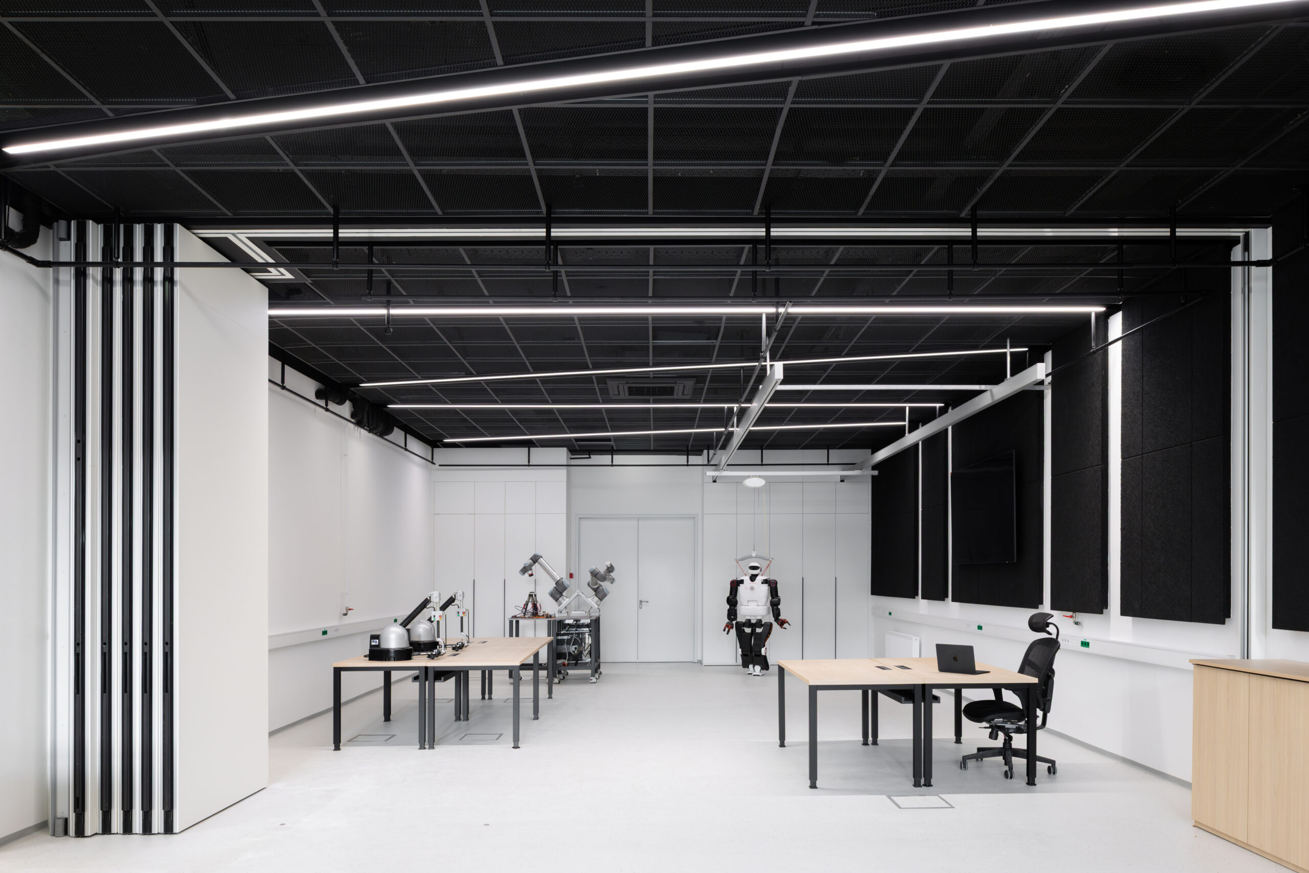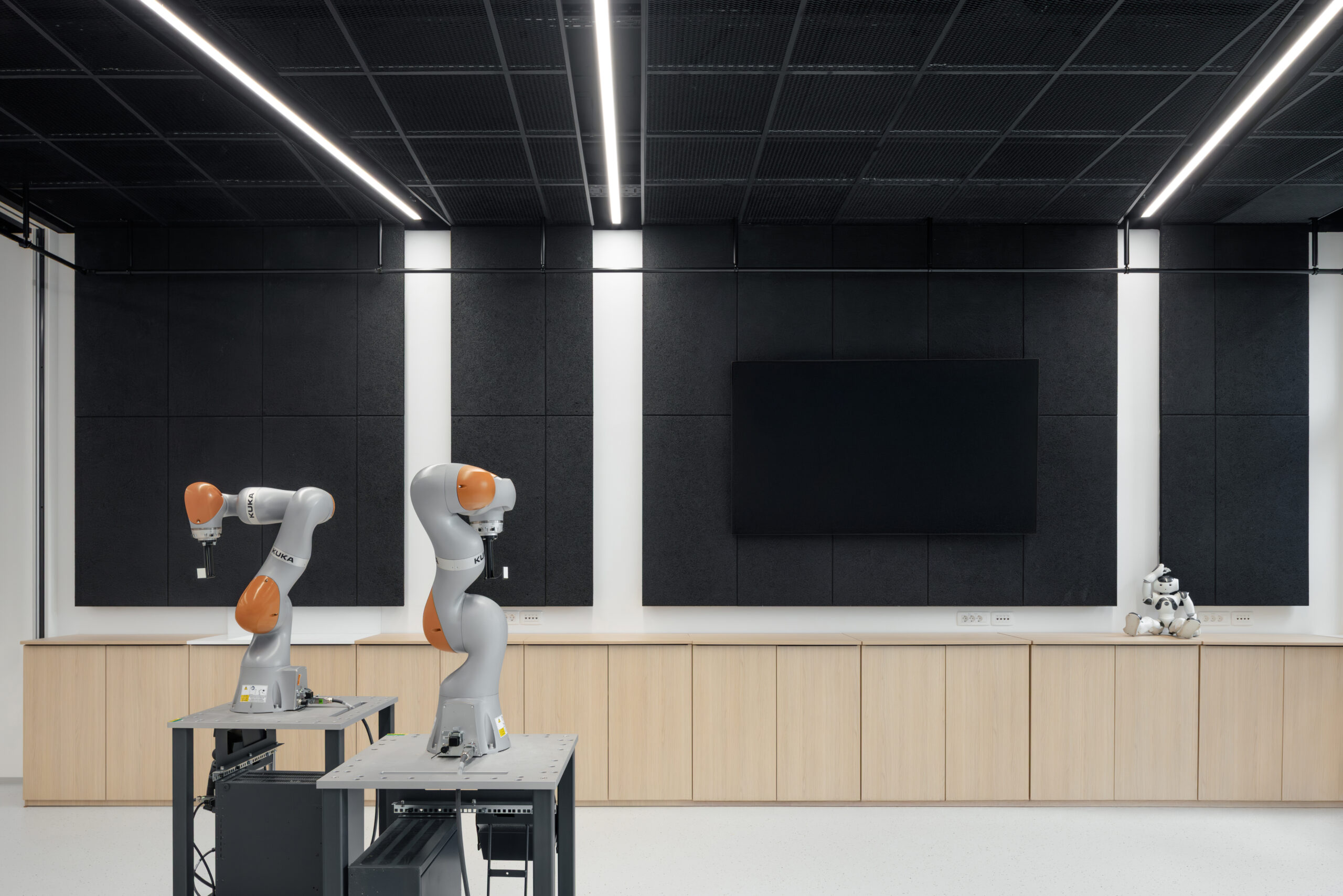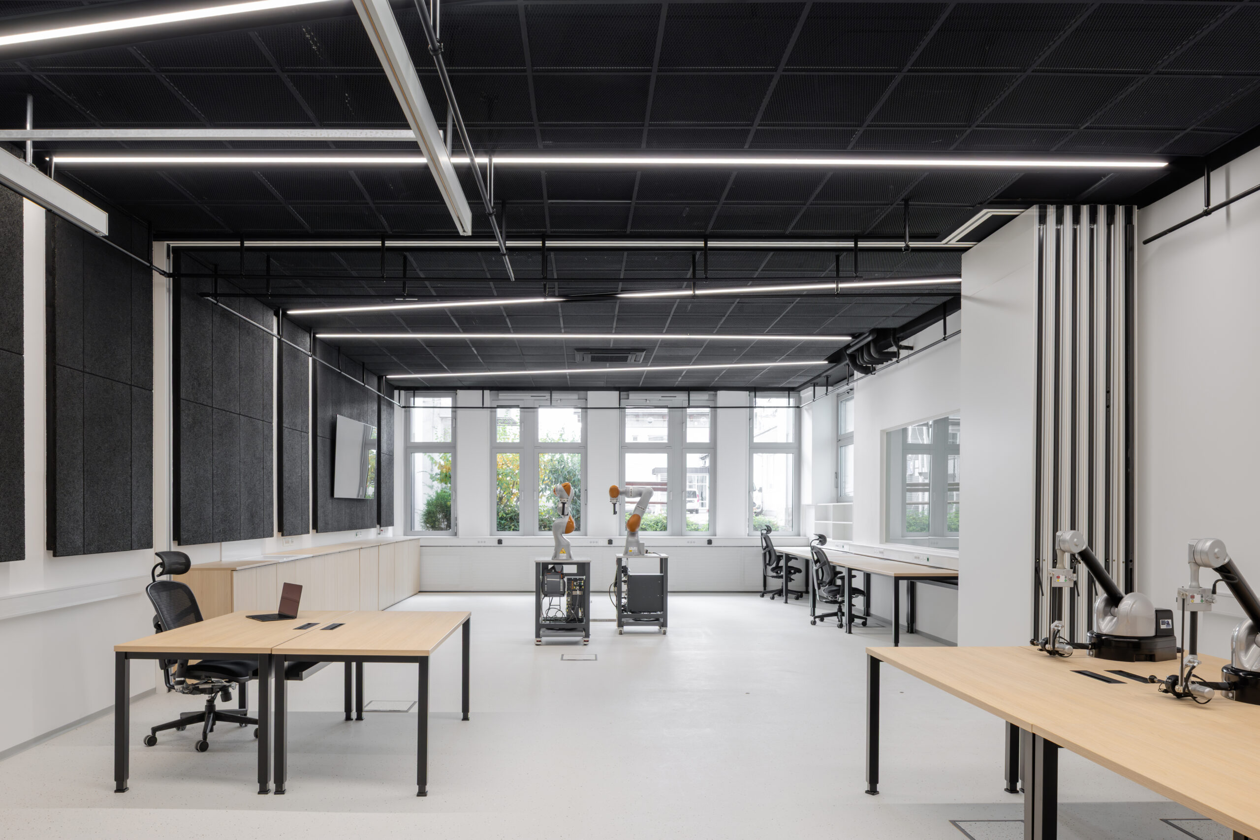Prenovljen laboratorij je zasnovan kot odprt in prilagodljiv prostor, ki omogoča različne postavitve in načine uporabe. Elektro instalacije so se iz parapetnih kanalov prestavile v talne doze, kar omogoča lažje premike delovnih pozicij. Strop je rastrski, sestavljen iz kvadratov črne perforirane ekspandirane pločevine. Na strogo mrežo stropa so v diagonali postavljena linijska svetila, ki nakazujejo možne funkcionalne cone prostora. Členitev iz stropa se nadaljuje v ritem črnih akustičnih stenskih oblog iz lesne volne. Učinkovita geometrijska igra črnih elementov in svetlega epoksidnega tlaka s posipom gradi močan kontrast, omehčan z lesenimi pohištvenimi elementi (omare in mize).