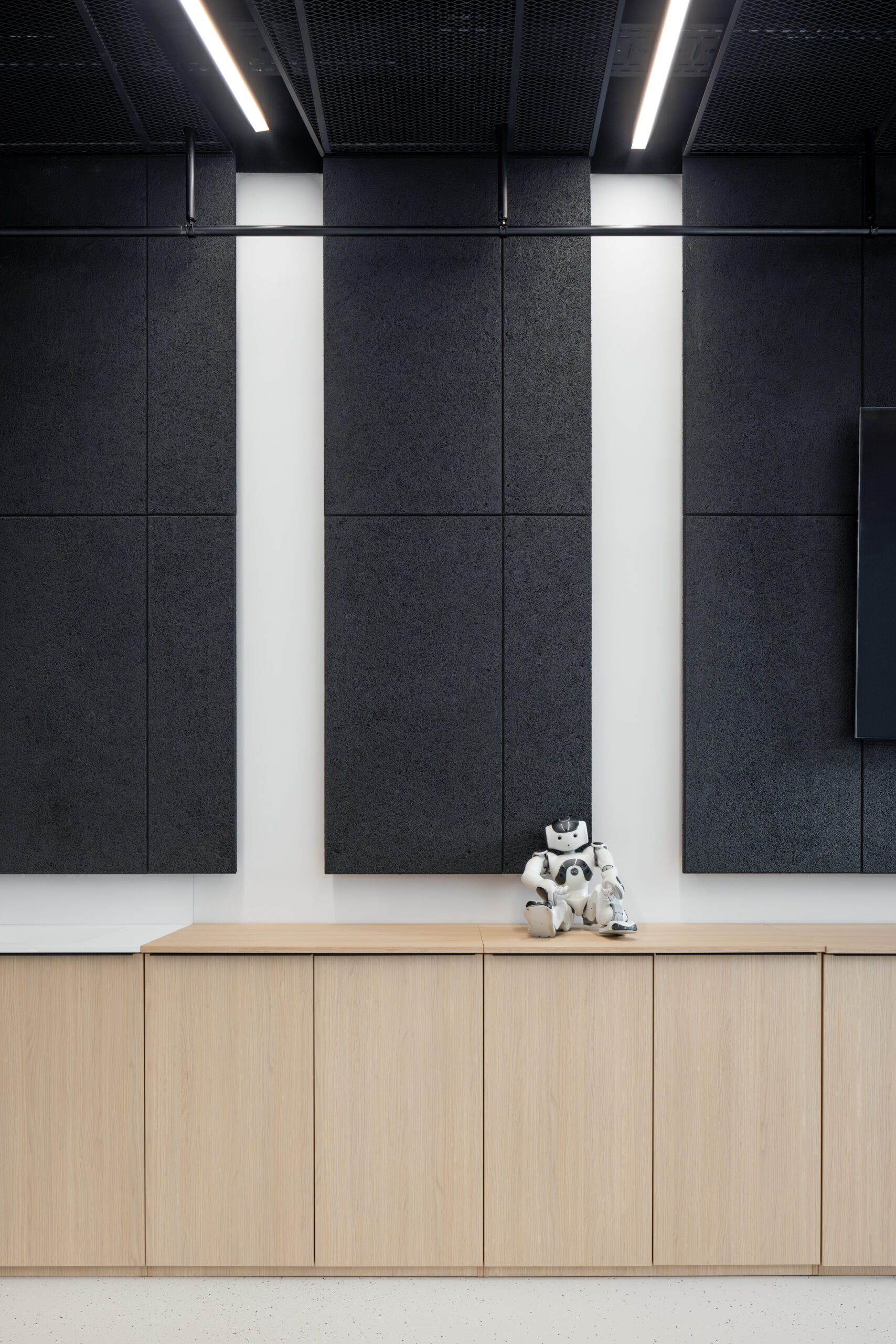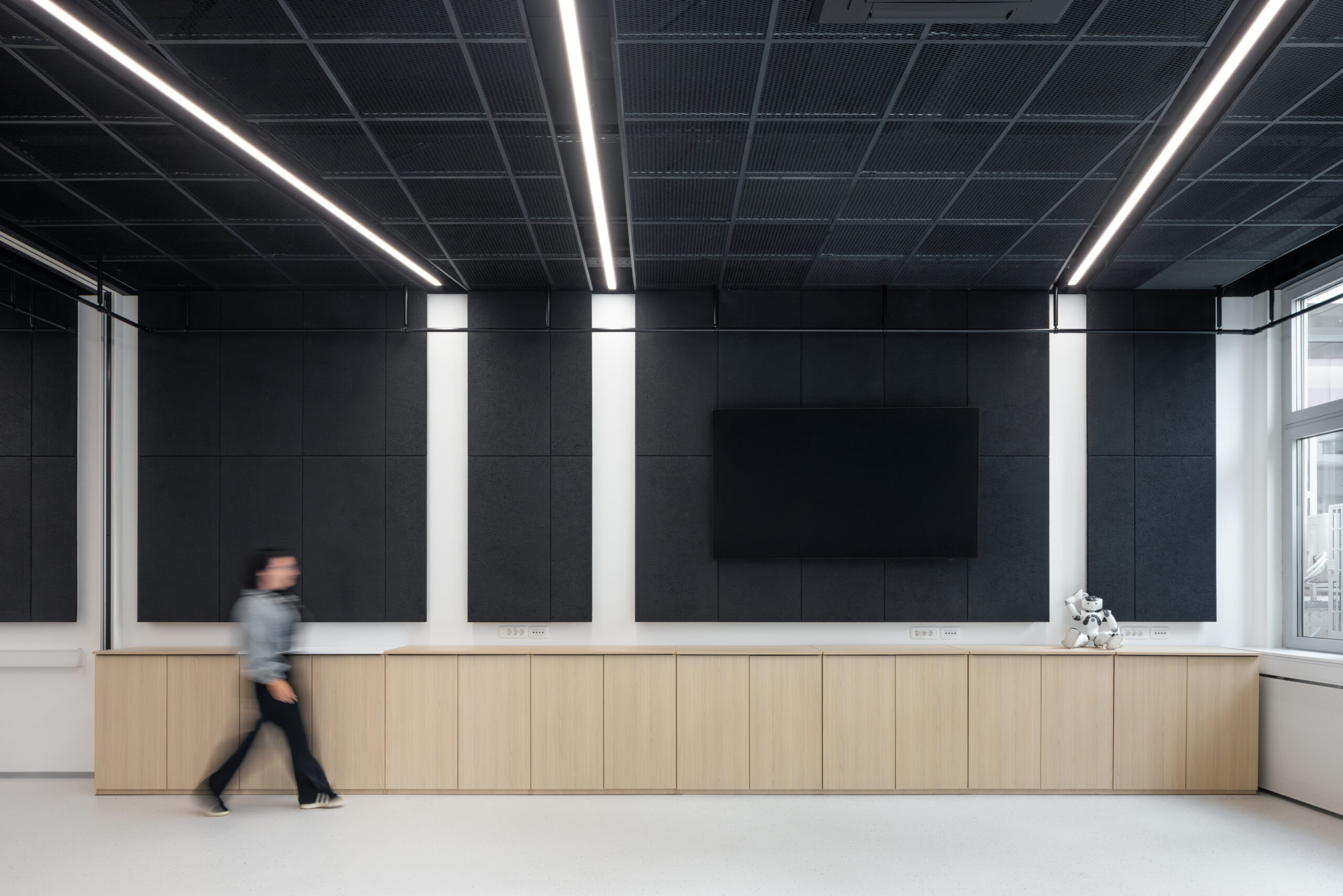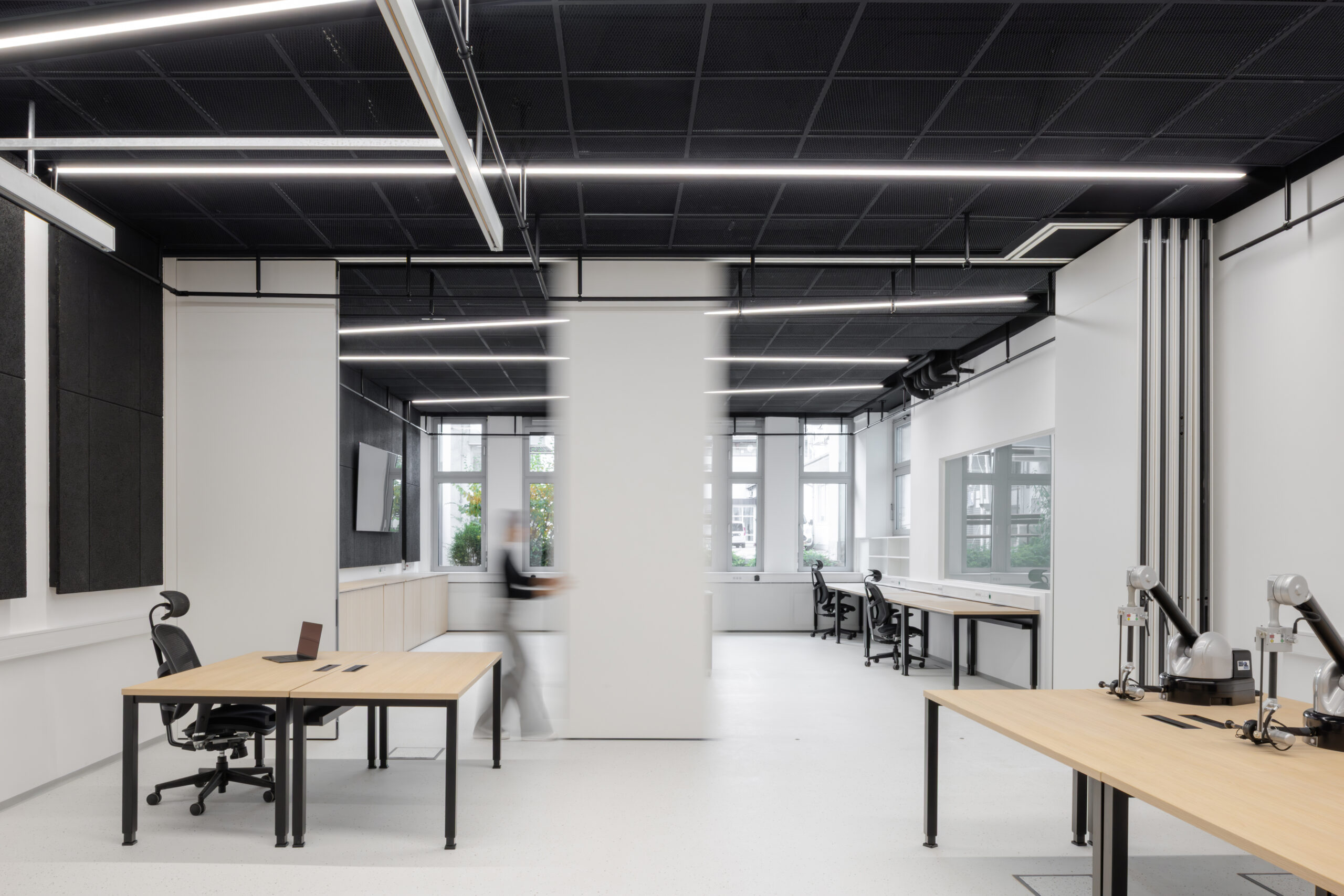 Prenovljen laboratorij je zasnovan kot odprt in prilagodljiv prostor, ki omogoča različne postavitve in načine uporabe. Elektro instalacije so se iz parapetnih kanalov prestavile v talne doze, kar omogoča lažje premike delovnih pozicij. Strop je rastrski, sestavljen iz kvadratov črne perforirane ekspandirane pločevine. Na strogo mrežo stropa so v diagonali postavljena linijska svetila, ki nakazujejo možne funkcionalne cone prostora. Členitev iz stropa se nadaljuje v ritem črnih akustičnih stenskih oblog iz lesne volne. Učinkovita geometrijska igra črnih elementov in svetlega epoksidnega tlaka s posipom gradi močan kontrast, omehčan z lesenimi pohištvenimi elementi (omare in mize).