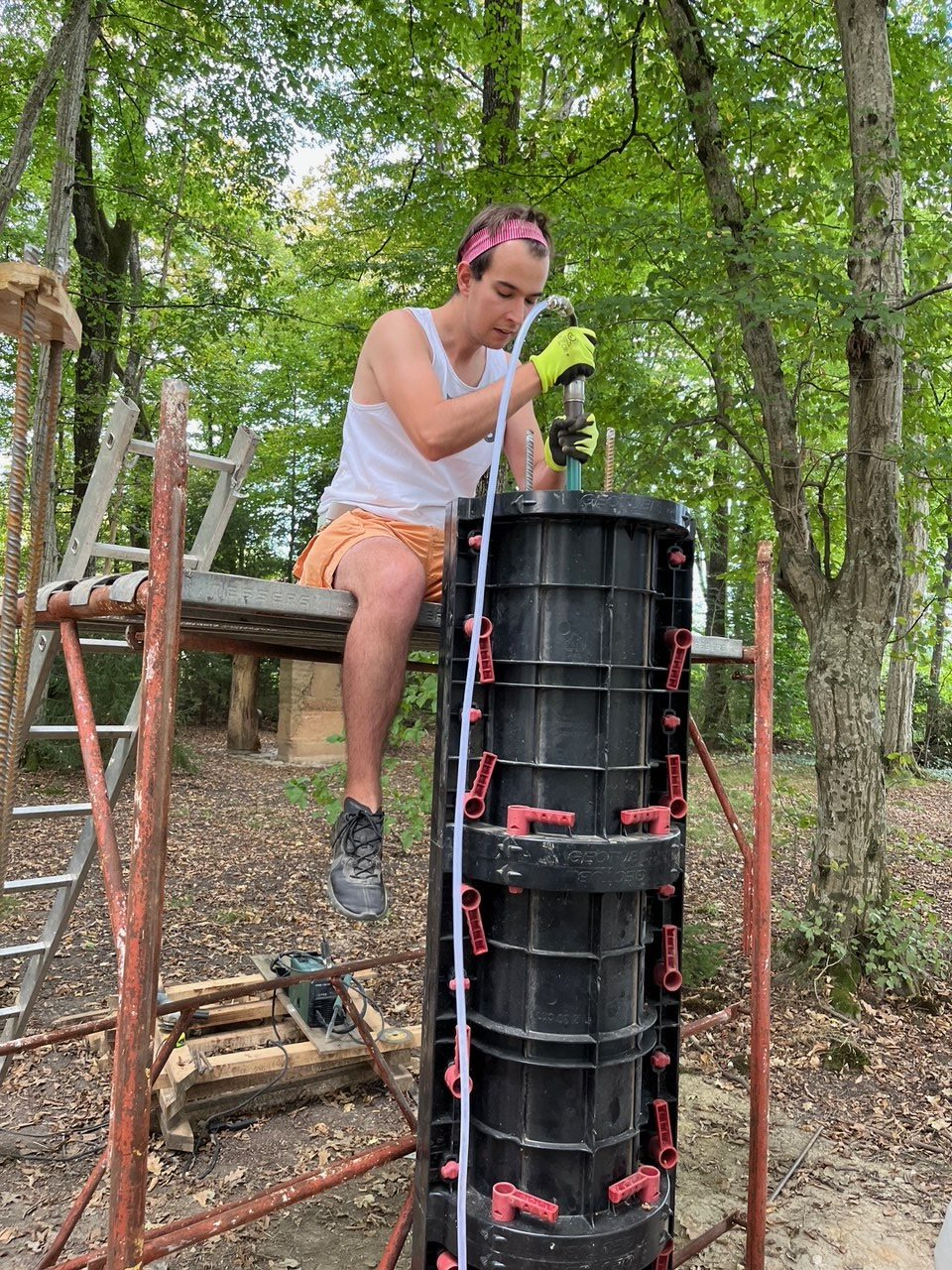 Naše delo se je začelo z izgradnjo četrtega stebra. Tri stebre smo uspešno zgradili že na prvi poletni delavnici in kasnejši vikend delavnici avgusta. Drugi dan delavnice je bil do polovice zgrajen že peti steber. V naslednjih dneh bomo dokončali še preostale in paviljon pokrili z enostavno streho.