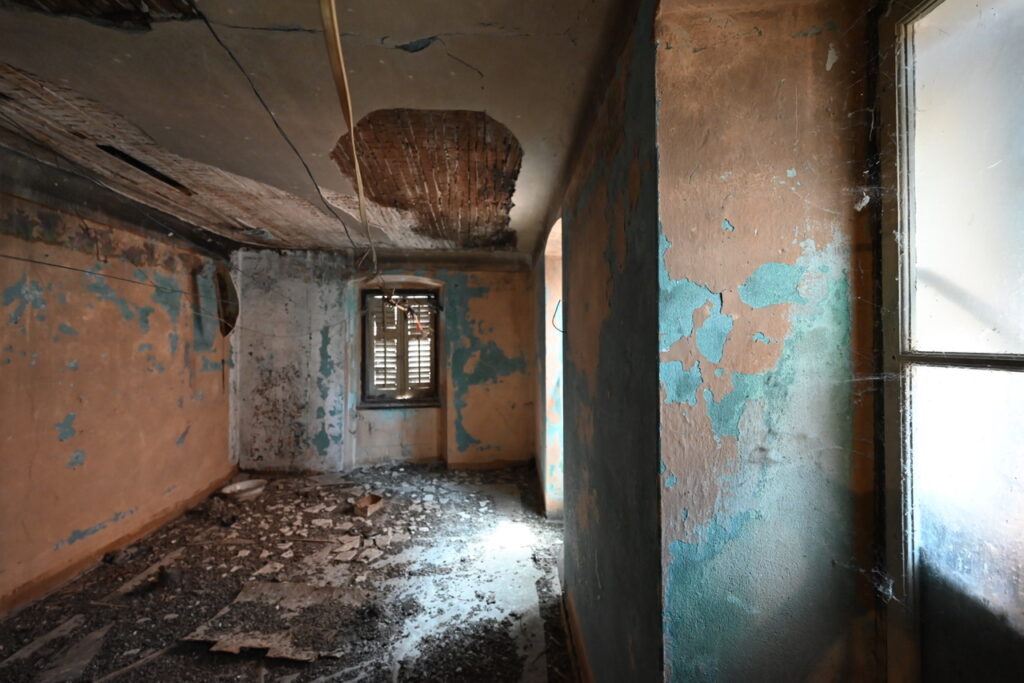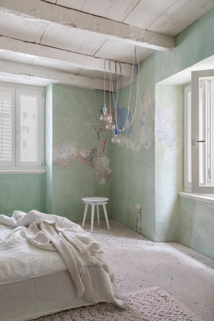 Po zavitih lesenih stopnicah, ki sta jih ohranila in prenovila, se povzpnemo v prvo nadstropje, nato v drugo in vsak prostor je privlačen na poseben način, saj je v vsaki etaži teraco izpadel drugače, kot bi ga izdelal umetnik v različnih razpoloženjih. Vsaka soba je unikatna tudi zato, ker sta Nina in Matevž ohranila stene takšne, ko so bile, ko so odstranili umazanijo in je ostala le patina; ob tem pa sta se igrivo navezovala na barvo fasade hiše. Le dele, ki so bili preveč poškodovani, sta obnovila. Iz prvega nadstropja kuka zelena barva, v zadnjem nadstropju je bolj modra, a povsod mojo pozornost pritegne predvsem tisti zapis časa, podoben zemljevidu, na katerem so oceani in celine razvrščeni po lastni volji ali preprosto glede na obstojnost barve, s katero so stene pobarvane, v kdo ve koliko plasteh, ki so se nalagale ena na drugo, tako kot so se stoletja nalagala in obračala to mestece v zgodbo.